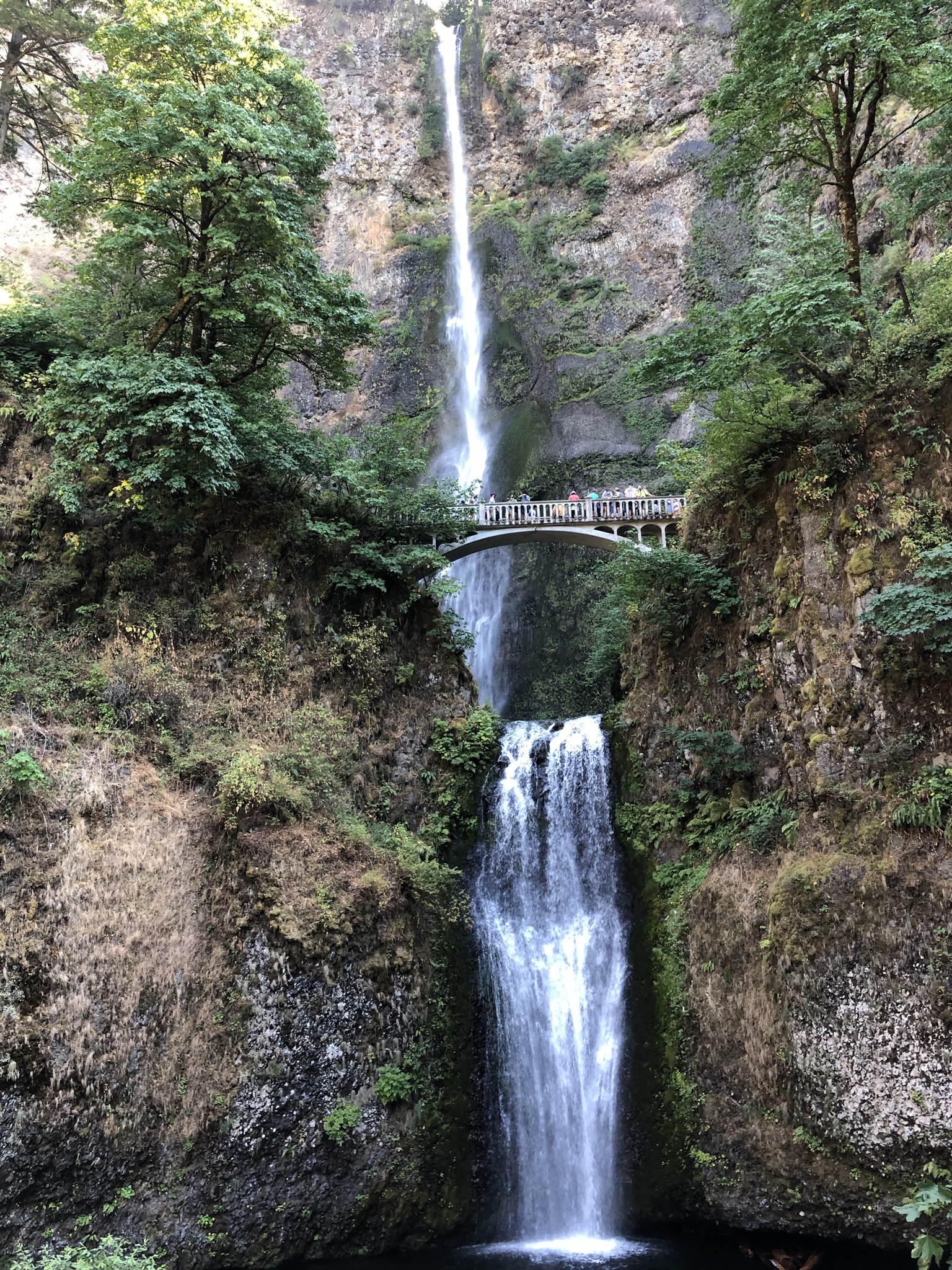 After Latourell I did a 2/3 mile hike down to Bridal Veil falls, where I ate lunch by a nice creek. Now afternoon, it was starting to get a little more crowded. This came into full view as I attempted to park at my next stop, Multnomah Falls, the tallest in the state and a very popular photo spot. I had purchased a $1 timed entry ticket in advance, but that didn’t help me find a parking spot. To get there, I had to drive several miles east down the historic road to reach the interstate entrance going the other direction. The parking lot was right in the middle of the interstate, and as I pulled to exit left, a man in a pick up truck had just put out traffic cones to block my entry. I locked eyes with him and he did not flinch, so I pulled back onto the highway. It took a while and a few tries to figure out how to loop around, and bad service meant google maps was not cooperating great, but about 20-30 minutes later I found myself on the other side of the interstate and entering to find a spot. You could see the falls from there, it was so big. Walking under the highway and entering the falls area, I could see why it was so popular. Masks were required outside here, as well as in the giftshop and café. Walking up to the falls and showing my ticket it continued to be swarmed with people, but the viewing areas were awe-inspiring. The path went up and over a bridge, and then continued up, turning into a hike. I went up a bit but decided to turn around and continue on with my day, with several more stops planned. I ate the rest of my lunch and got back on the road.