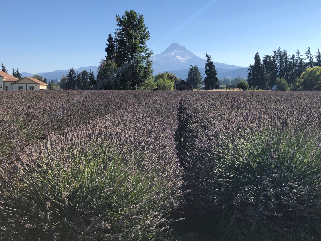 My next stop was a bridge called Bridge of the Gods in a little town. It was meh, but a pretty bridge and view. Maybe I missed something in the area. I continued to drive by lots of other giant waterfalls, some which I could see from the road. When I made it to the town of Hood River, about 60 miles east of Portland, I turned down south through what is adorably called the Fruit Loop, a marketing strategy to play on the area’s many farms, apple orchards, and other produce-themed attractions. Here I got my first views of Mt. Hood, a famous and huge mountain. I drove through some rural roads to my isolated destination, Lavender Valley. It was closing within an hour at 5 but that was more than enough time to revel in the fields with the intoxicating and relaxing smell of lavender. It smelled so so so good and was also a great photo spot with Mt. Hood in the background. I bought some stuff inside their shop and learned a bit about the products from the clerk. I was so happy after this.