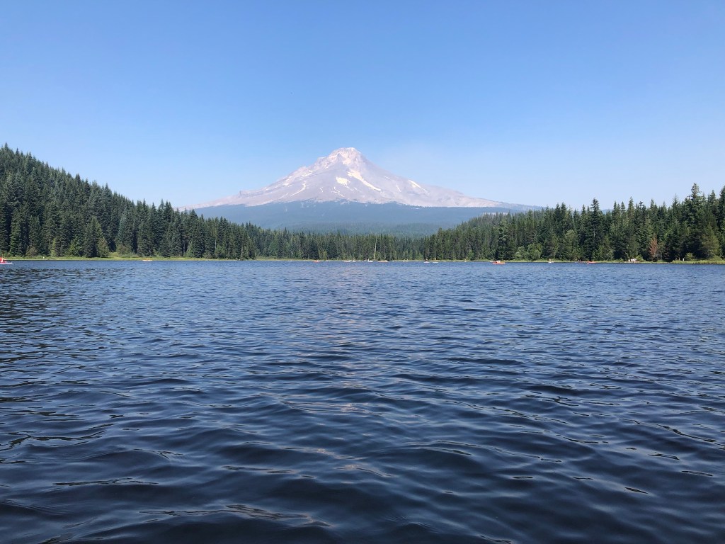 After picking up a gross sandwich at the lodge I took a short drive onward to Trillium Lake. I paid $10 to park and walked to the very-crowded lake. And it was gorgeous, a deep blue lake surrounded by forest with Mt. Hood right in the background. I had hoped to rent a kayak but they were all out, so I rented a paddleboard. The rental guy was grumpy but watched my stuff, since I couldn’t wear my backpack on the board. I’m comfortable with a kayak and I’ve tried paddleboarding a few times, sometimes successfully, but here I quickly found I couldn’t balance to stand, wobbling on the flimsy board and in the wind. So I just sat and kneeled, taking some comfort in seeing other people doing the same, and making fun of myself to the friendly passersby. Despite the crowds it was so nice, peaceful. I walked around the lake a little bit before heading out once again.