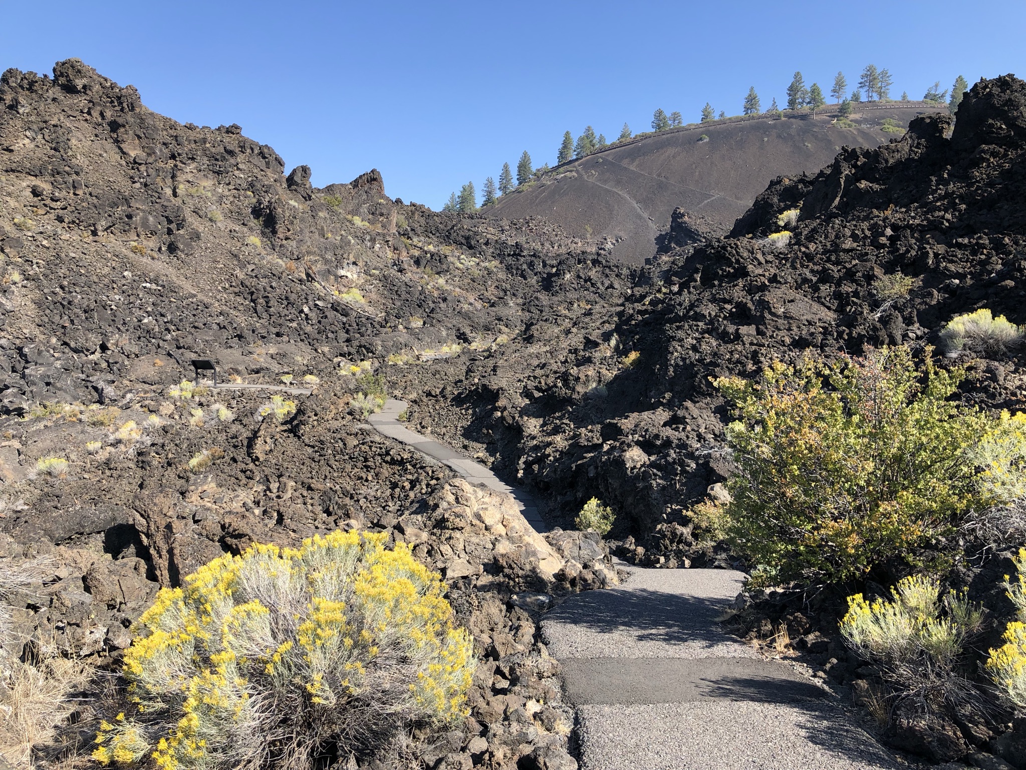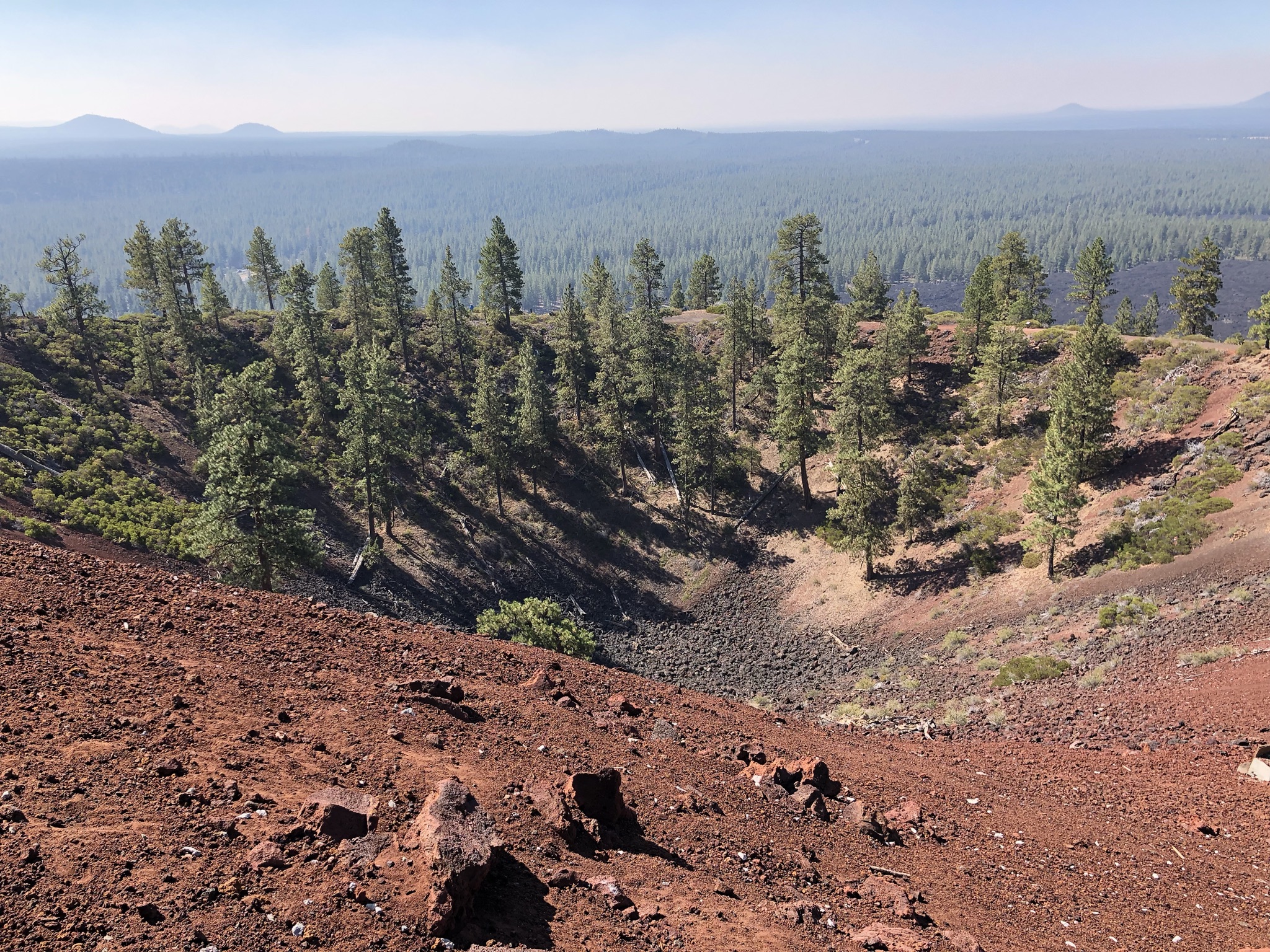After arriving in Bend on a clear evening, I woke up early and ready for a day trip I was looking forward to (Tamolitch Falls, hot springs, and more nature!). With glasses on the floor below my top bunk I blurrily peeked out the window shade by my bed, and thought it looked a little extra blurry, but like a morning haze that would probably soon clear up. I climbed down and commenced my weeks-long daily ritual of checking air quality on my phone, and was shocked to see it high up in the “very unhealthy” category. Since the fires were out in the direction of the day trip I wanted to do, I saw that it would be just as bad out there. I decided to change my plans, taking a slow and calm morning to figure things out, chatting with some folks at the hostel over breakfast while I researched. It was a tricky predicament: due to covid I really wanted to prioritize outdoor activities on this trip – plus Bend is very outdoorsy – but it would be tough to be outside for too long due to the smoke. Good thing I’m a planner, because I had a lot of backup activity ideas for the area. I settled on driving to the Newberry Volcanic National Monument, just a 15 minute drive away and thus giving me the option to come back easily if I needed to. It ended up being really cool! I used my National Parks pass to get in for free, parked in the not-crowded lot, and got some tips from the park ranger on what to do. I ended up doing a one-mile paved hike that showcased the landscape, a sea of craggy lava rocks under a cinder cone from a past volcanic eruption. It was very cool! I mostly stayed masked to help with the smoky smell, though I grappled with how clear the air looked up close despite the smell. After my little hike I took a shuttle bus up the cinder cone (like a mountain/hill), winding around a road several times to reach the top. There I walked around the ¼ mile circular and steeply-sloped view of the caldera, which inside was growing trees – truly a unique landscape with almost no people around! I ended the experience eating my packed lunch by some picnic tables, fighting off some very aggressive chipmunks.