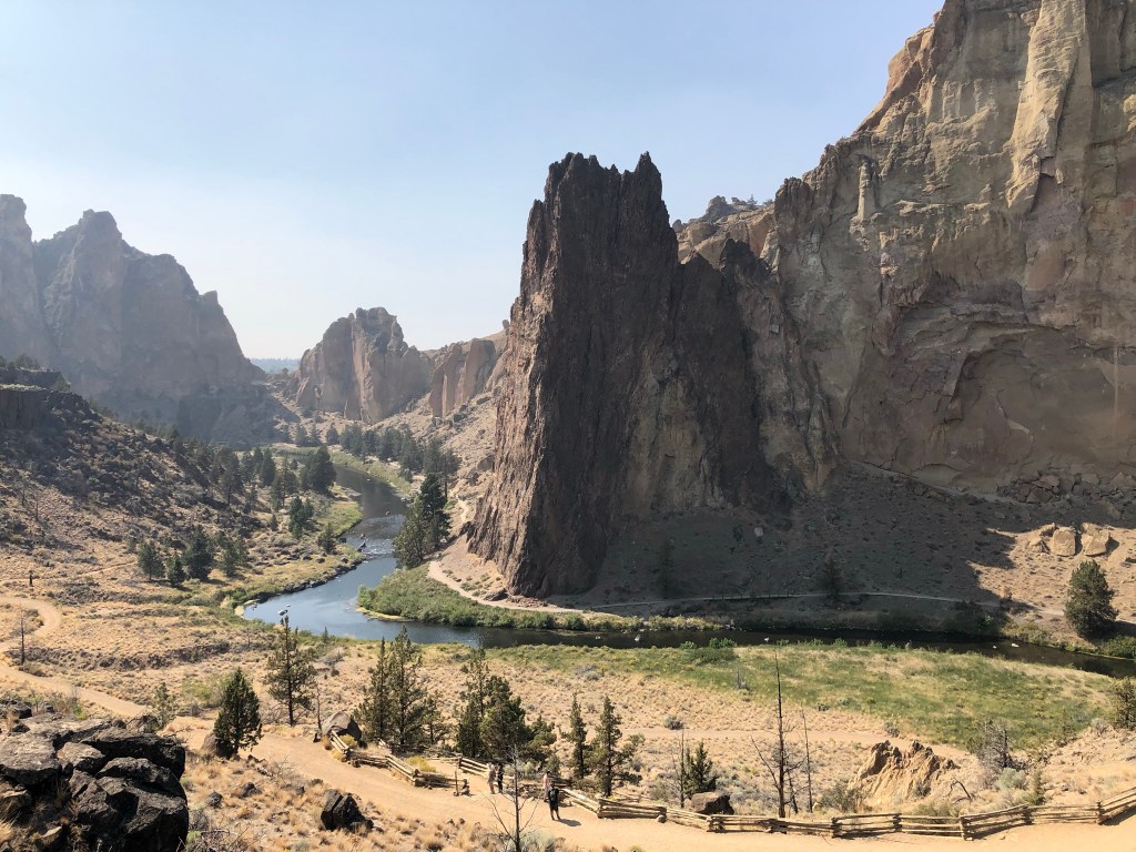 After a nap back at the hostel, I drove 35 minutes north to Smith Rock State Park, a highlight I was excited to see the more I read about it. While I really wanted to check out some of the difficult hikes, it was way too smoky for me now. I found myself wearing a mask even in car, because the smoke smell was coming in with AC. It was hot out now in the high desert, after a cooler morning, but not unbearable. I ended up parking near some incredible viewpoints and just walking back and forth a little, looking down at the brave, mask-less hikers and up at the awesome rocky formations. I really wanted to hike down, but I knew that what goes down must come up, and I was struggling enough walking around flat and getting out of breath. I’ll keep this one on my list to get back to one day! On my drive back I had the difficult job of finding gas, cutting it a little close. As I drove I decided I was grumpy about the smoke and wanted to leave early. So I cut my Bend stay a day short, got a much-appreciated refund from the hostel (who does that?? So nice!), and moved up my 3 night stay outside of Crater Lake to start the next day.
