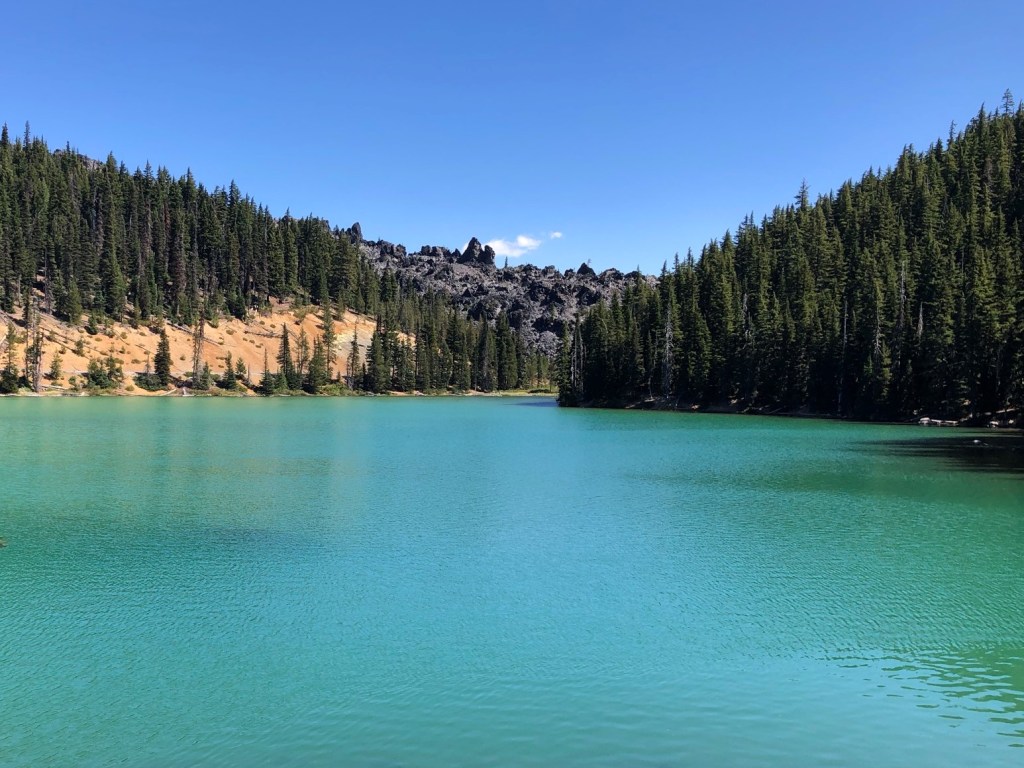 I continued on to the nearby Devils Lake, another coworker recommendation. The lake was small and visible from the road, but what really stood out was its stunning and crystal clear turquoise color. I loved it, and decided to take the little hour+ out and back trail around one side of the lake. Aside from near the parking lot and across by the road I didn’t see a single other person, so I really got to enjoy the nature, solitude, and lake views.