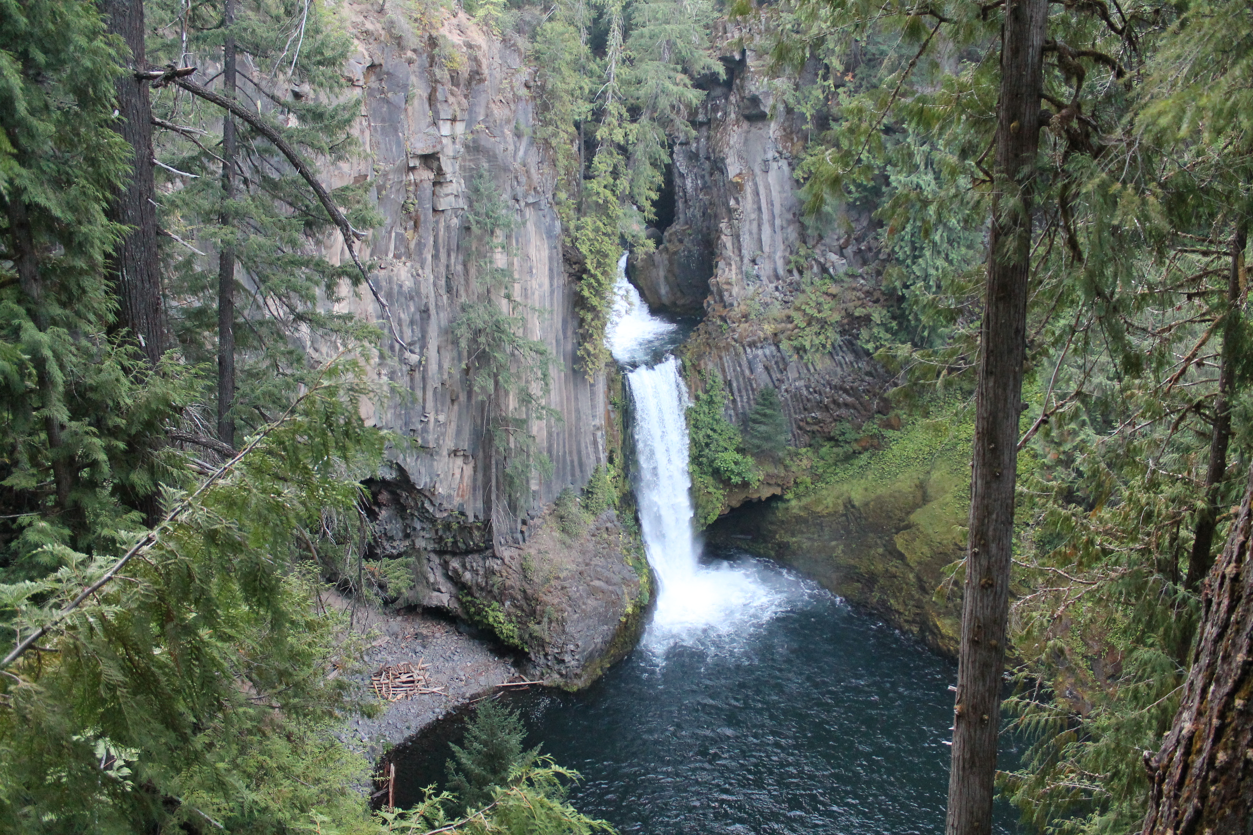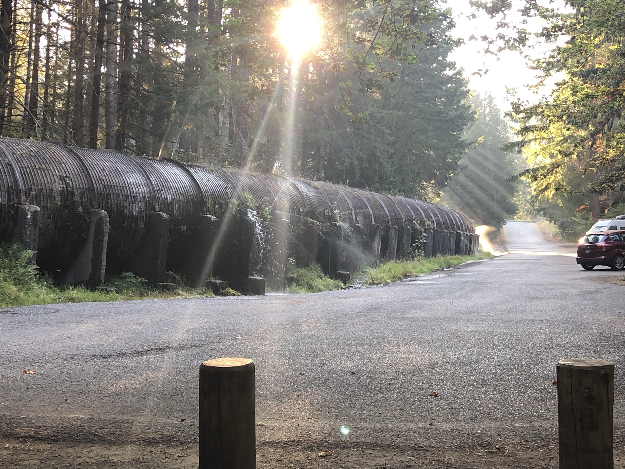 With clear skies, I decided to make a stop for a short hike to Toketee Falls, another popular waterfall hike of just about a mile out and back. The parking lot – empty except for a van that I think people were sleeping in – featured a giant tube leaking water in several spots. As I got ready to hike I saw one other car and solo hiker come in; I ended up seeing him going out on my way in. It was a lovely, lush trail that I had to myself that ended in an elevated viewing platform of the falls. I had read online about people who climbed to the bottom, and so I noticed next to a hole in the fence a rope was secured to help people descend the near-vertical rocks. It was way too intense for me, especially being there alone, so I took a pass. I was glad I was able to squeeze in one of my planned hikes in the smoky region.