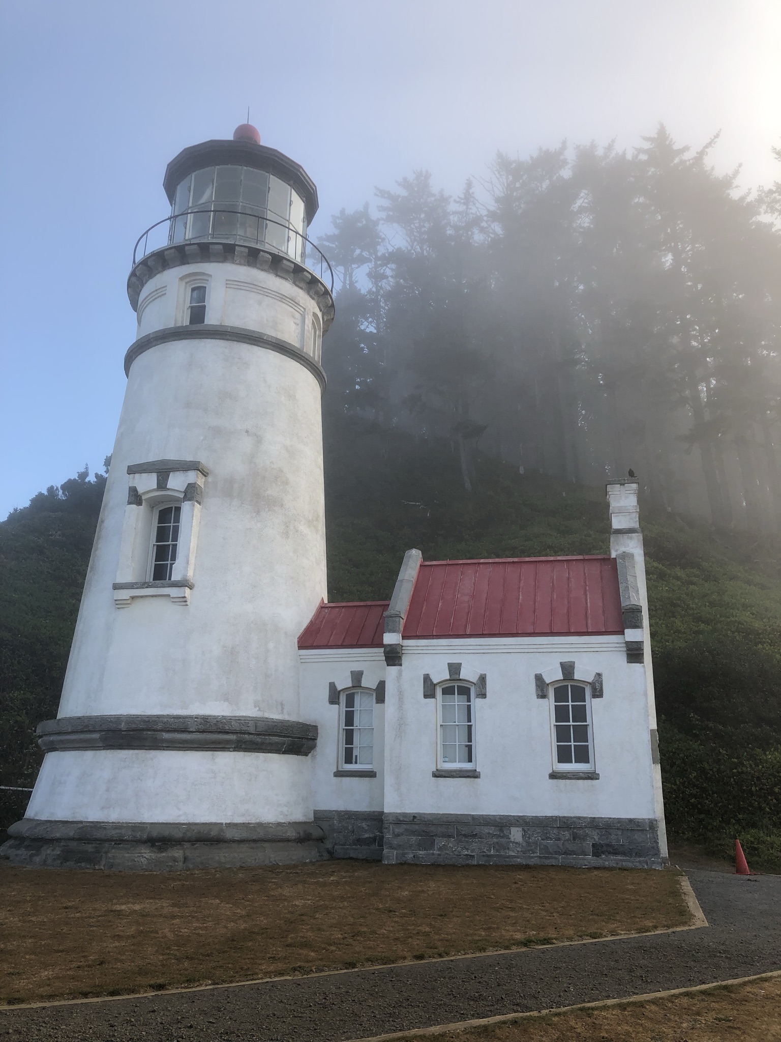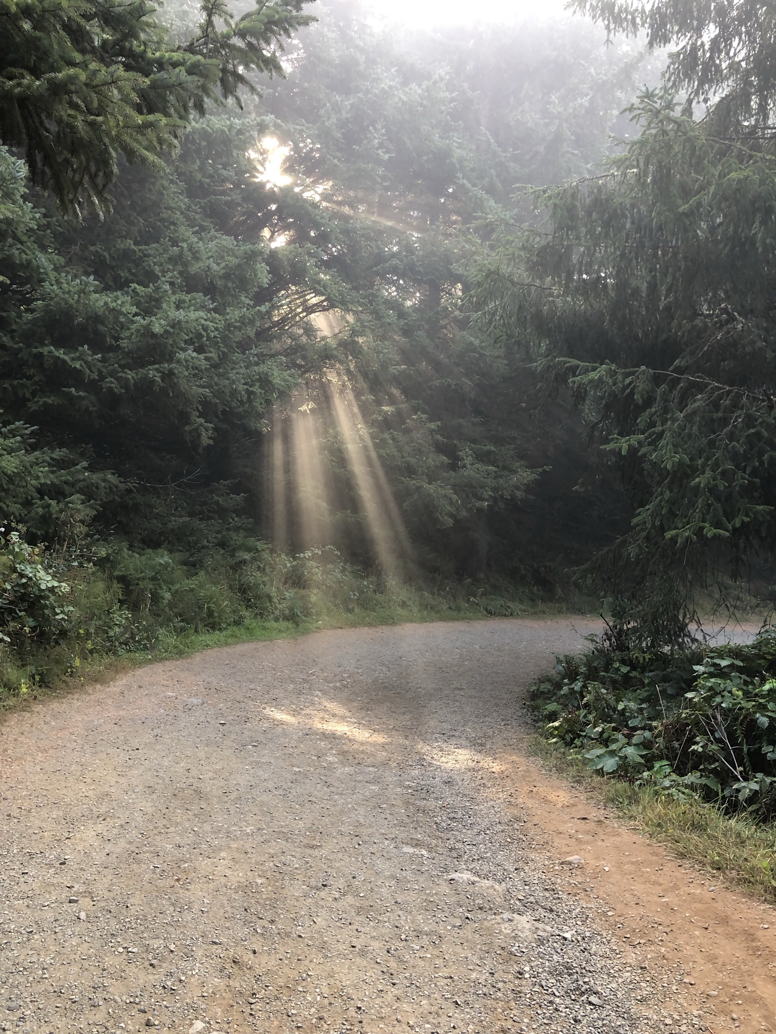 I left early the next day to start an ambitious day of driving up the coast and then looping inland to meet up with Katie in Salem. I planned this coastal part of the trip almost entirely through tourism magazines, which the Oregon tourism bureau had mailed to me for free and I had brought along. As I left the hostel parking lot I noticed 3 other cars there, and I waved to some people I saw. A few minutes into my drive, it immediately became very foggy. Unlike driving through smoke, I was struggling to see the road in front of me, and it got a little scary. I decided to turn around and head back. After sitting in the car for 15 minutes and mulling my next move, I figured I’d just have to buck up and keep moving. It was a little better for a bit, but then got worse again. I just drove slow and got through it. I made it to my first stop, Haceta Head Lighthouse, where in the parking lot it was still very foggy but in an interesting and cool kind of way, now that I was no longer driving. I noticed a foggy beach at eye level here. Since it was early it wasn’t crowded, and I just saw two people walking down, one dog walker near the beach, and a parks cleaner in the parking lot bathroom who told me to enjoy the road trip and take it slow (she wasn’t the first person who told me that since arriving on the coast – a weird old man watering the plants at the hostel told me the same thing yesterday). So in the isolation I walked the half mile hike uphill to the lighthouse, which apparently is a famous photo stop. The fog was really cool to hike in, and despite the bracingly cold weather I had a great time. Some hike highlights included wild blackberries, loud birds, an inability to see the ocean below from the lighthouse, and awesome sunlight through the trees and fog.