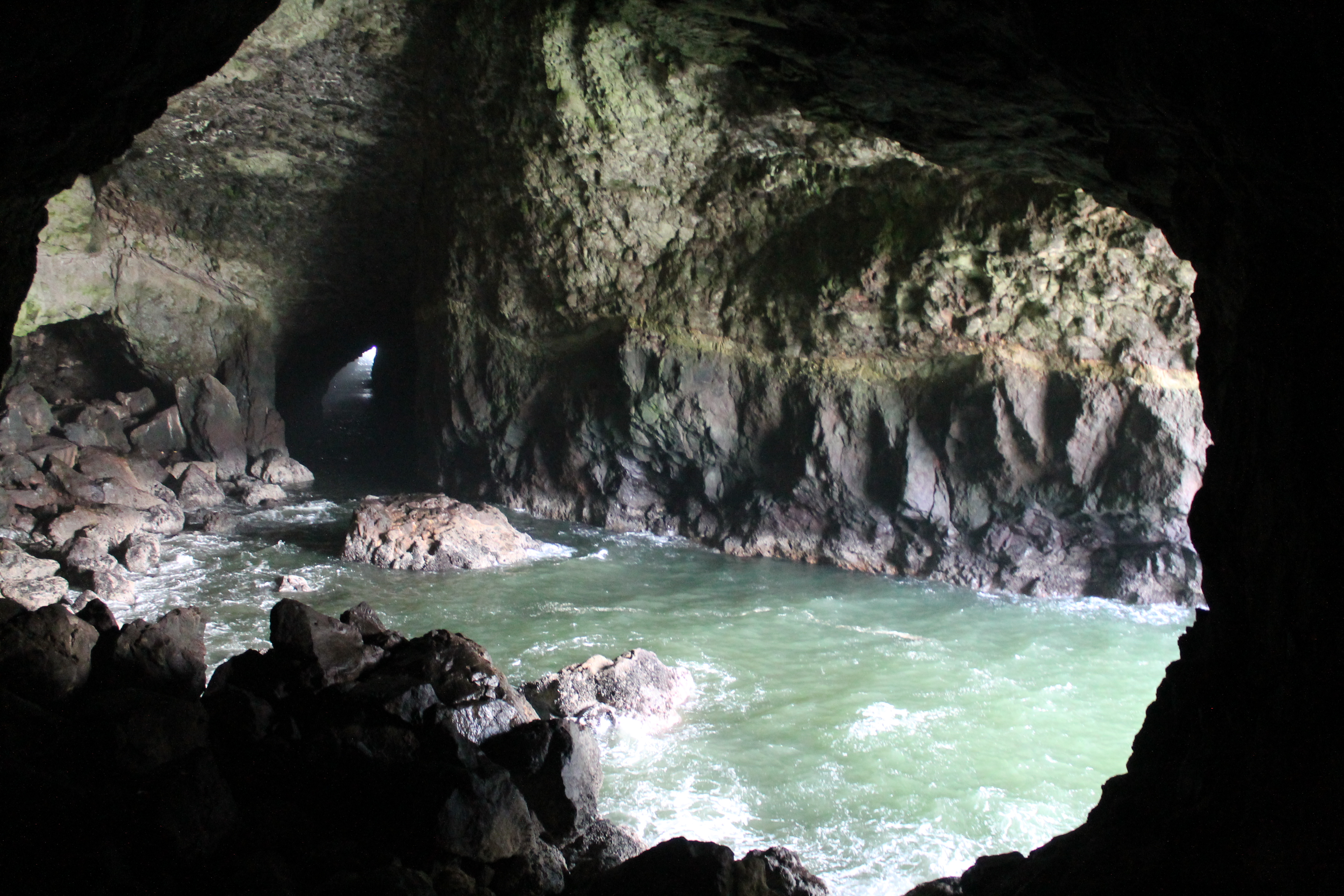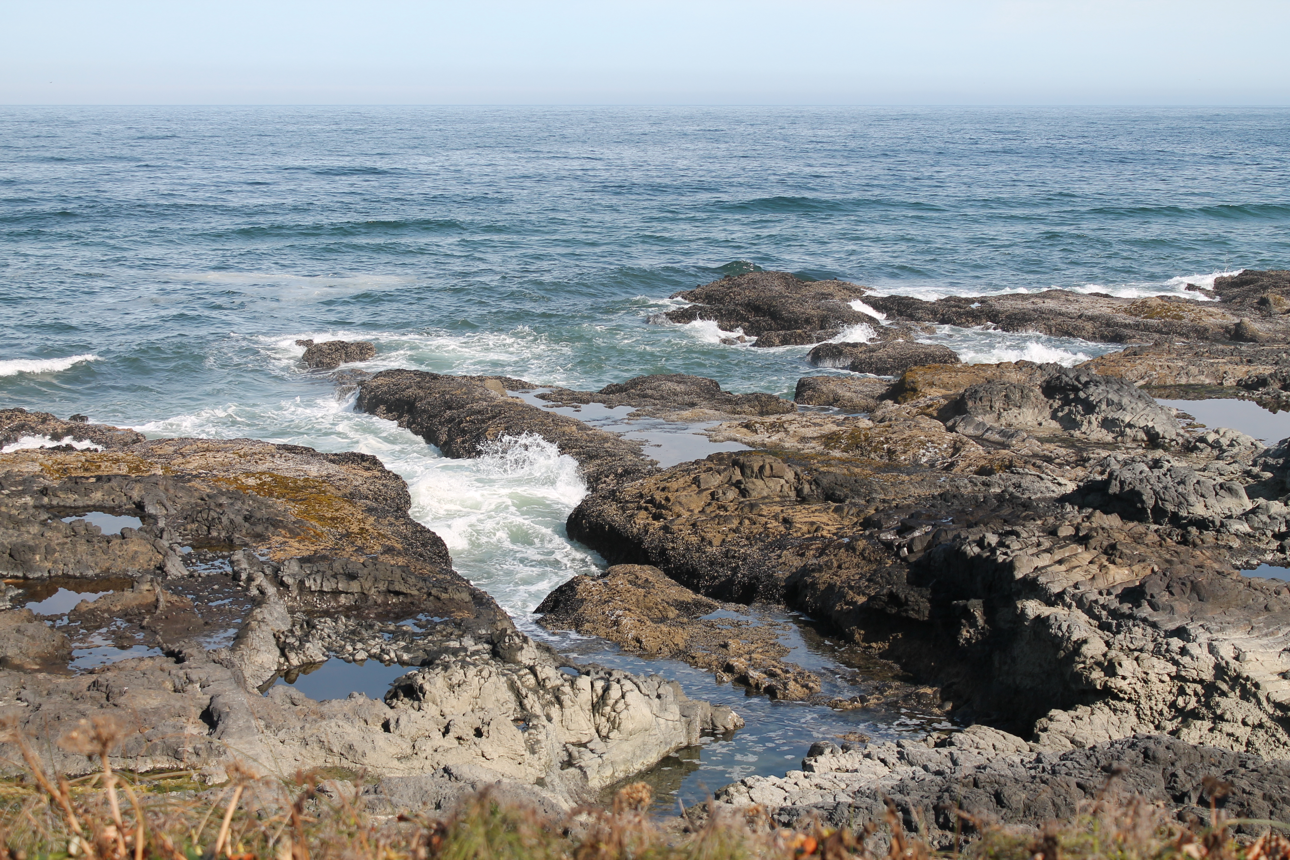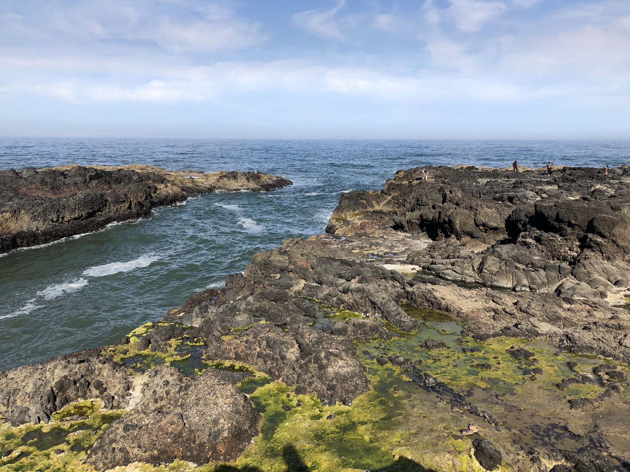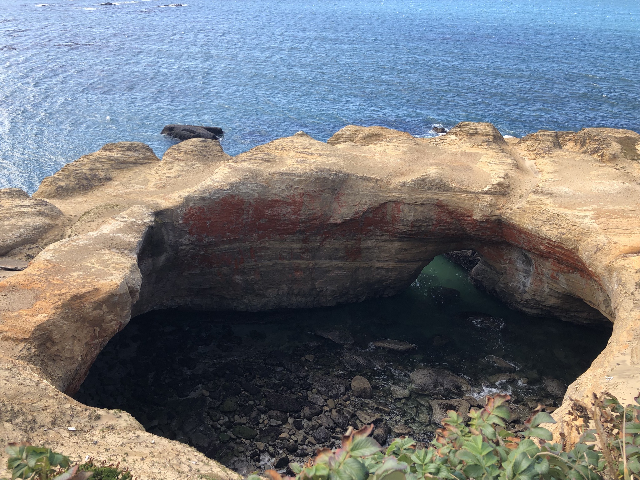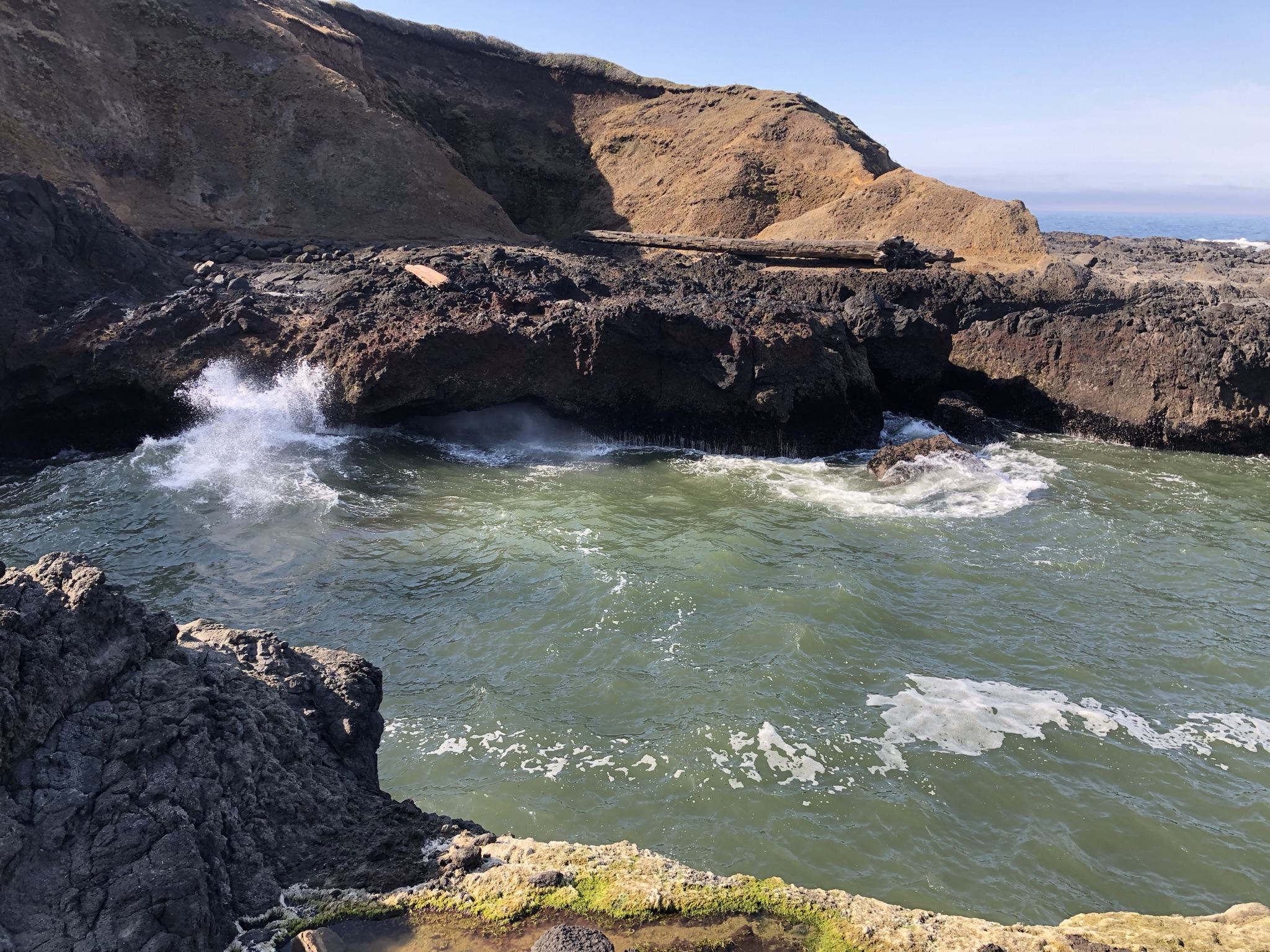 As I drove on I found myself climbing uphill and going above the fog for a bit, then back down into it, and then seeing it clear. It continued to be in and out for the rest of the day but was mostly clear. It was wild! My next quick stop was a viewpoint the parks cleaner recommended called Strawberry Hill, where in total solitude I climbed down some rocks and onto the beach, enjoying the amazing views. My next driving stop was also pretty close by at Cape Perpetua. Here, like some of my stops today, I was able to use my National Parks annual pass to cover parking, while other stops were state land and I had to pay a little bit to park, like at Haceta Head. Cape Perpetua was a little bigger spot with a gift shop and staff around, with paved sidewalks available for hikes near the ocean. I zoomed through some of these hilly walks and got to play around on some tidepools. These connected to a formation called Thor’s Well, sort of a U-shaped, cave-like inlet of water that made awesome splashes and roaring noises. I almost got wet a few times standing precariously above on the wet rocks but stayed dry and didn’t slip in! It still wasn’t too crowded but I was starting to see other people around. My next stop just a minute down the road was called Devil’s Churn, where I did a half mile loop trail that was also paved and accessible from my last hike area. With clear skies I was really enjoying myself now!