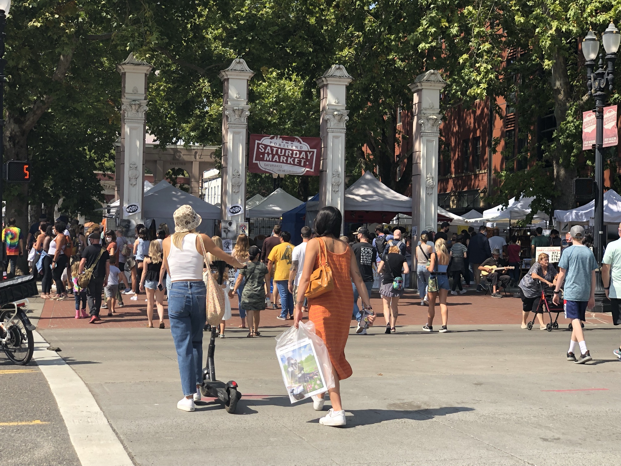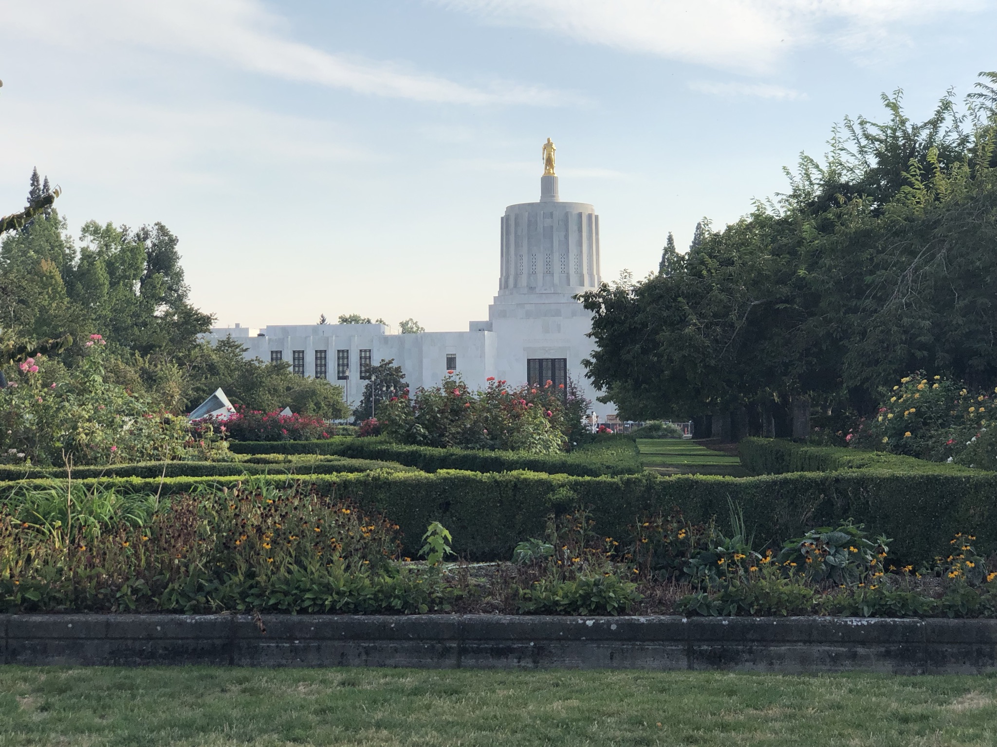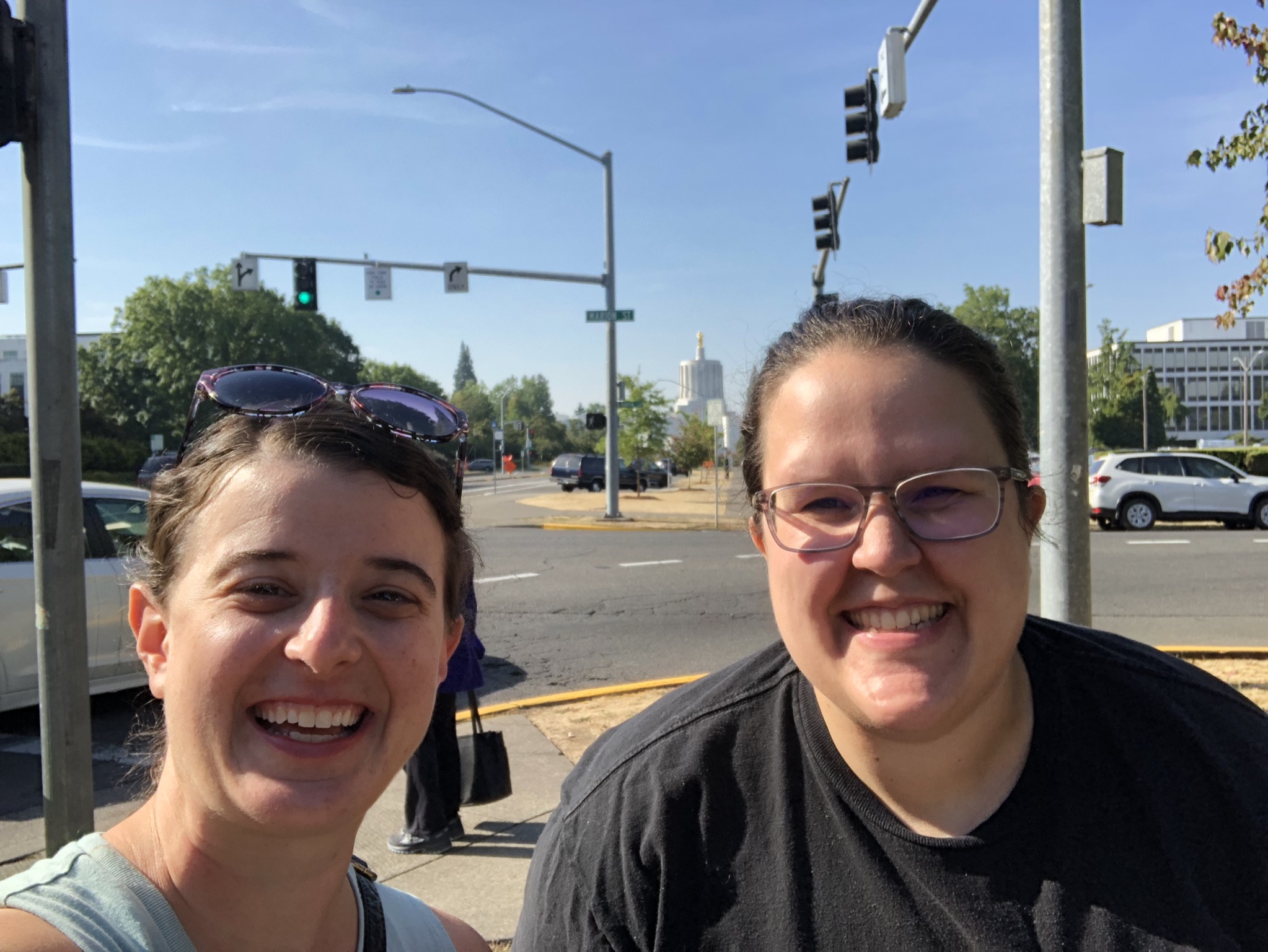 I finally called it a day and did the hour 15 minute drive inland to Salem, arriving in the late afternoon. Katie worked with me in New York and moved back to her hometown of Salem during the pandemic, but kept her job in NYC remotely. She bought a house and got two big dogs, Atlas and Otis, who were jumping around a lot and enjoying the big backyard (a perennial reminder of what type of life is possible outside of NYC). As a lifelong non-dog person this was a lot for me, especially adding the third foster dog for that day, Sawyer. Especially the next morning when I woke up early and decided to go out to organize the car, and while I was out there Katie woke up and let the dogs out back and they wouldn’t let me back in the back door so I had to go out front and ring the doorbell… But it was a fun experience! And always really nice to meet friends and have some personal hospitality during a solo trip. We chatted and caught up a lot, and I gifted her my remaining perishable food. Then we walked downtown via the Oregon State Capitol grounds, a non-domed building with a gold man on top (another one checked off my list). We got some dinner in a chill restaurant (mac and cheese!) and then explored a park with a nice sunset and a not-great high school Christian band performing. The next morning we walked to a huge farmers market with Atlas, where I experienced dog culture where everyone comes up to play with your dog and asks you its breed and tries to give it treats. It was a lovely quick stay in Salem!