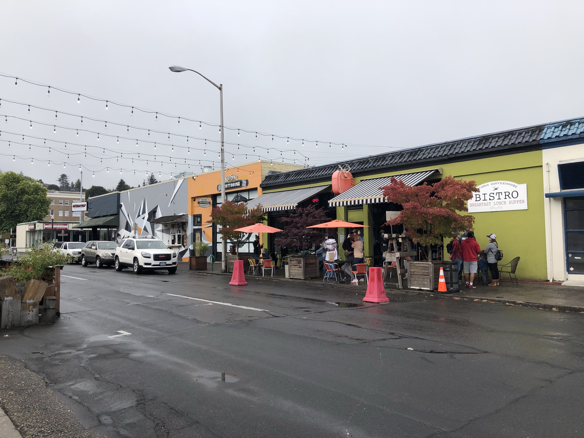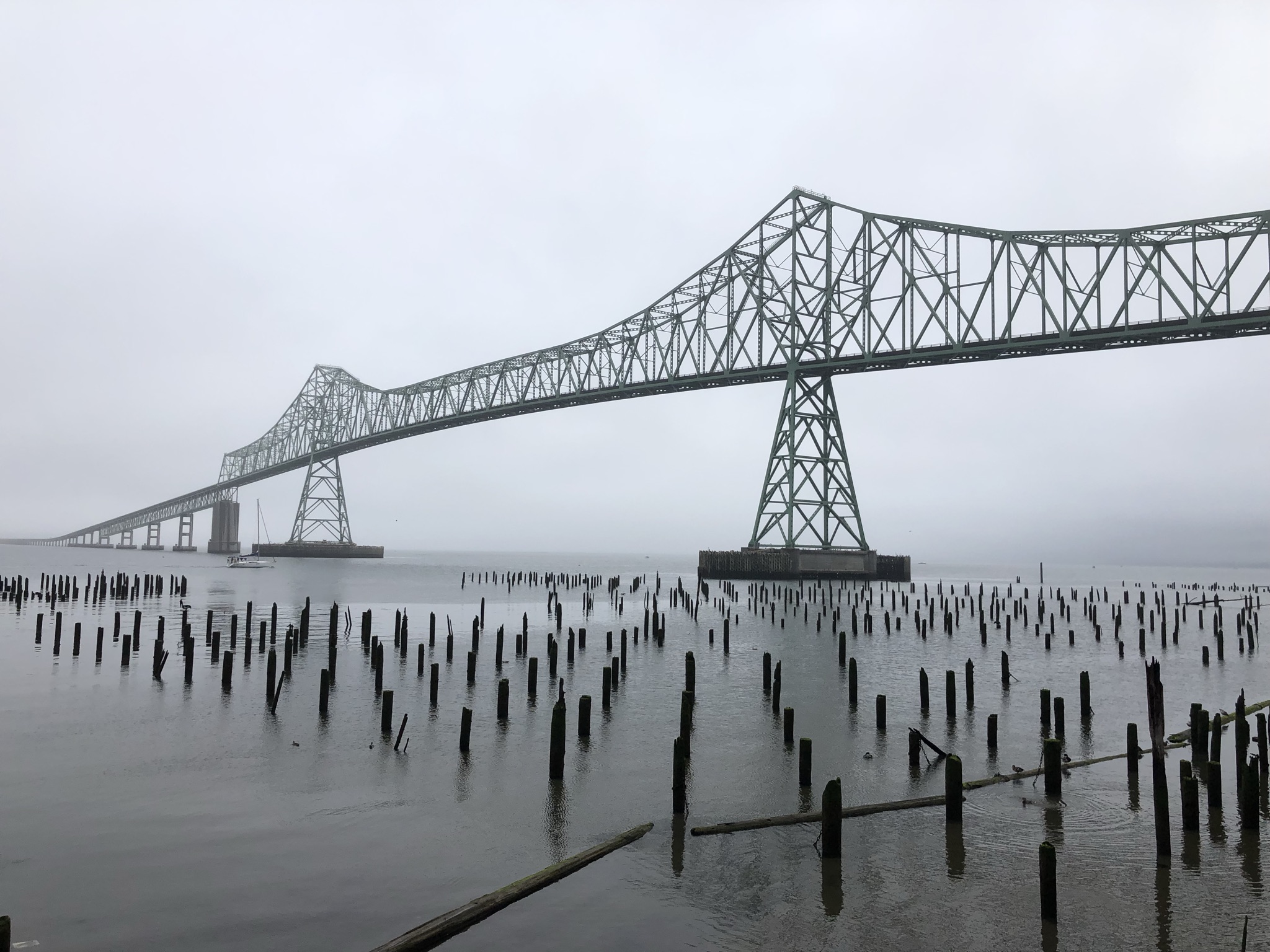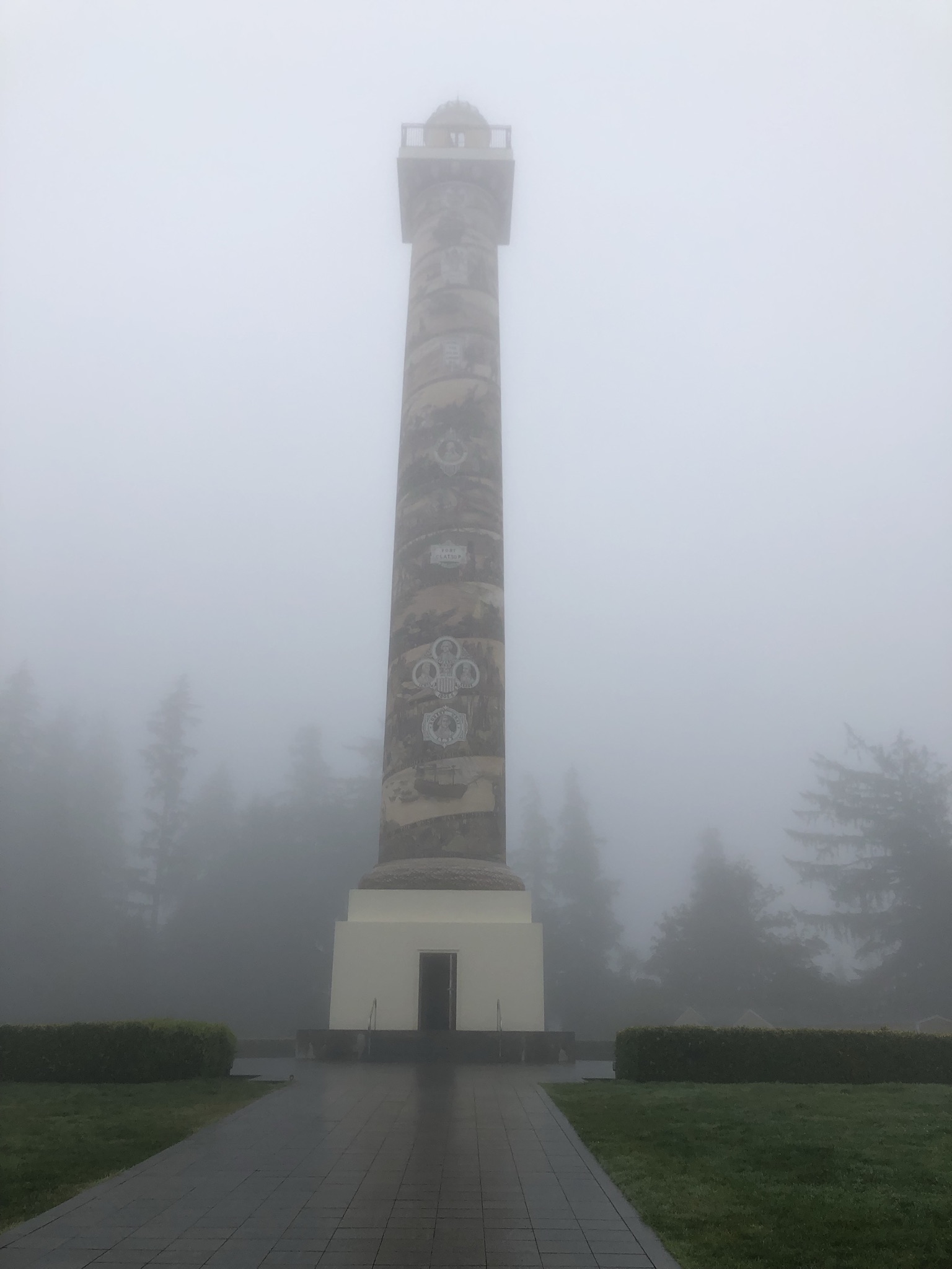 Sunday morning, and it’s my final day! I left the hostel at 7am, getting coffee there right as they were getting ready to open. I drove an hour and 45 minutes back toward the coast, this time passing through Washington State and looping back in to reach the northern-most coastal town in Oregon. Astoria, Oregon wasn’t high on my to-see list, but since I live in Astoria, Queens and it had gotten some good recommendations from friends I decided to go. I drove through a little drizzle on my way in, the first rain of the trip. As I approached the coast, the drizzle turned into a wet, dense forest. I couldn’t tell if it was raining (the phone app said it wasn’t) or if I was just inside a cloud (I guess so). I drove up some steep hills to sightsee the Astoria Column, which I couldn’t really see due to the weather, so I decided not to climb it for the non-existent scenic view. I parked in the downtown and visited a coffeeshop, then walked around a few blocks in the cute neighborhood and by the waterfront as a small farmers market was getting started.