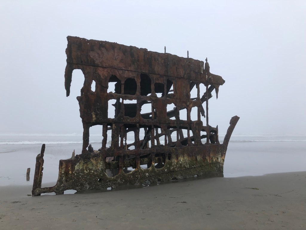 I continued to drive on to Fort Stevens State Park, another friend recommendation. It was a huge park you can drive through to different areas, filled with lots of historic cannons and stuff, including an iron shipwreck you could explore in the break of the waves on the beach. By now it wasn’t really rainy or wet anymore, but still very foggy, and by 10am there were a good number of people around.