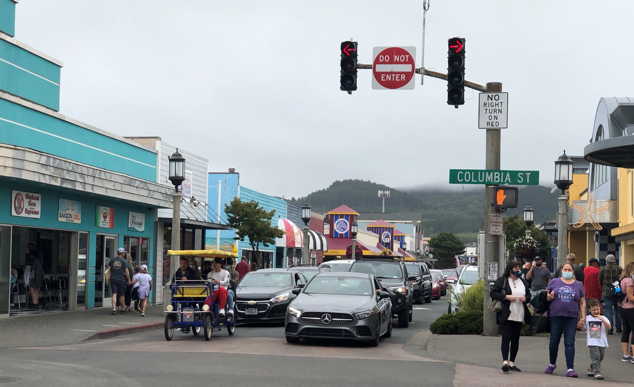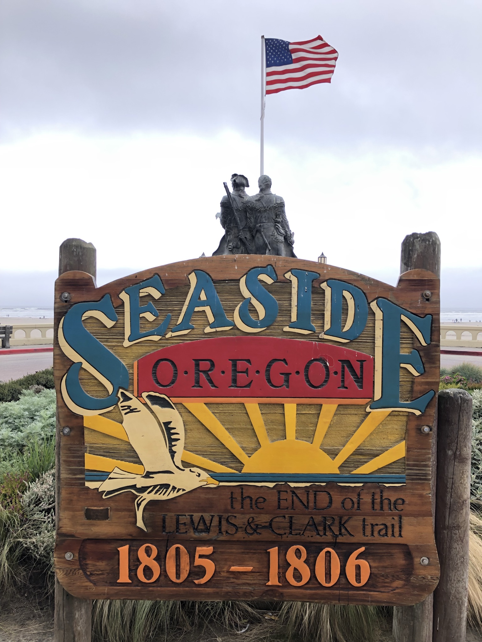 An hour later driving south I arrived at Seaside, a popular beachy vacation town. It was super busy on Labor Day weekend with lots of shops and a nice big beach, though still foggy there. I really enjoyed walking around here briefly, including inside one of the little malls and seeing a carousel. By the beach was a sign signifying the end of the Lewis and Clark trail. It was touristy but fun. Next up, a spot I was looking forward to but ended up being disappointing due to the fog – Ecola State Park. I drove up a narrow, windy, and foggy hill to get to a crowded parking lot, and as I walked to the cliffside I couldn’t see any of the scenic ocean view. I decided not to do the moderate hike I had planned to do, and instead left quickly and drove on. Next up, the other big popular coastal town of Cannon Beach. As I drove through it was cute but somehow even more crowded than Seaside, so I didn’t stop. The main attraction for me was the beach and some famous rock formations in the water. I managed to find a spot in a residential area with some fancy hillside houses, and walked downhill to a beach entrance right by the most photographed spot in the state, Haystack Rock. And naturally, I could barely see it. I still walked around a little and finally put my toes in the ice-cold Pacific Ocean. It was colder than Crater Lake but I was glad I did it! The beach was pretty to look out at, but looking down there were some dead birds and jellyfish washing up so it wasn’t totally pleasant. It was also crowded even with the fog. I lingered for a bit, then headed back out, failing to wipe all the sand off my feet and living with sandy socks for a few more hours. I skipped another planned viewpoint, feeling a little disappointed in my day so far and how weather and nature still managed to get in the way of my plans here on the last day of my trip.