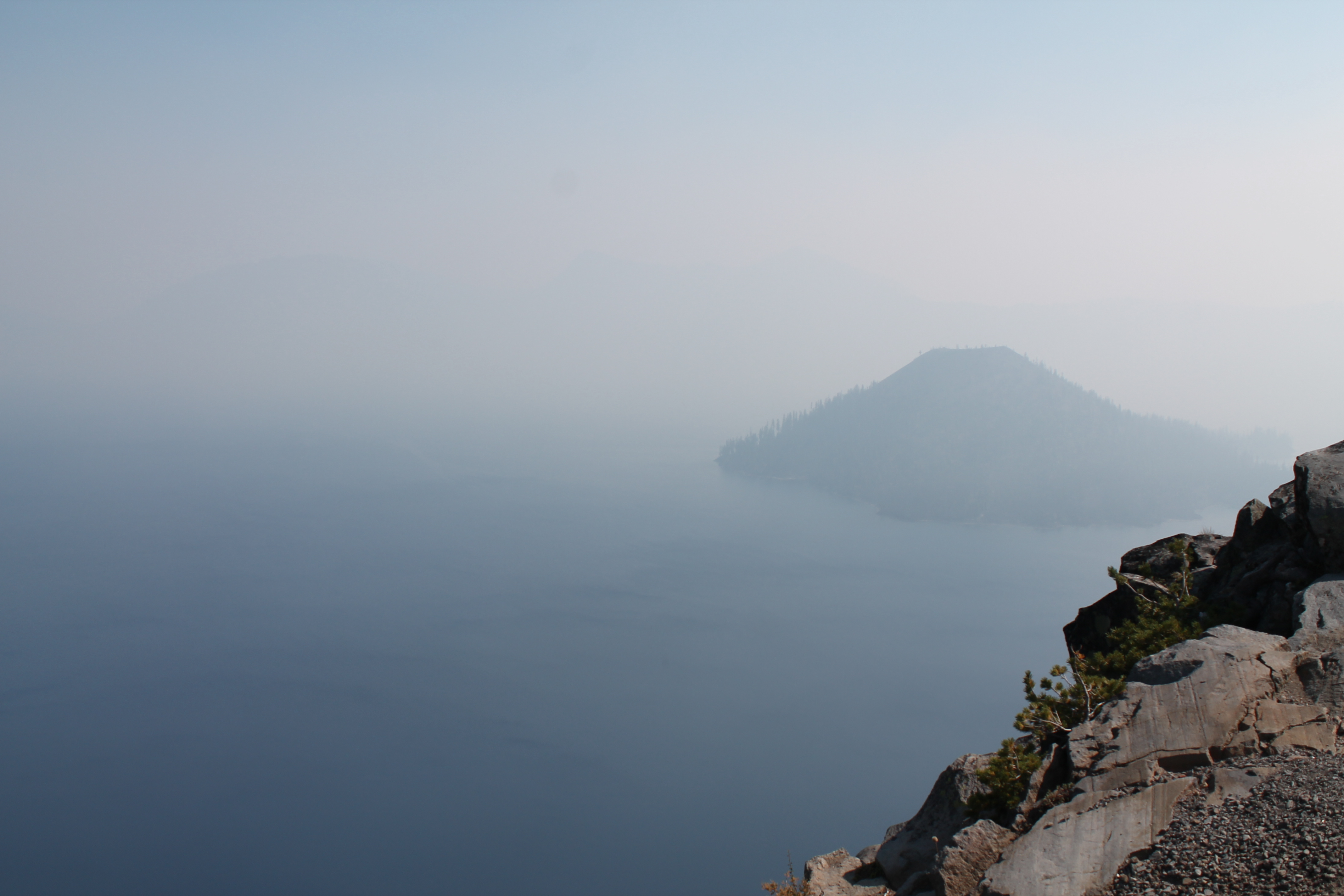 As I drove through the north entrance gate, which was un-manned, I started getting excited to see the landmark lake that had inspired the trip. I pulled the car over to stretch and use a bathroom, and really got hit by the smoke. It was bad. So I adapted to a come-what-may attitude and kept on driving until I hit the first pull-over along the 33-mile road circling the lake. And well, I sort of saw it. There was clearly something there, but it was completely shrouded in thick smoke and impossible to see anything clearly. The shores were a little more visible with the contrasting cliffsides down to the water, but it was just bad. I talked to an older couple who I overheard saying “well, that trip was a wash.” Turns out they lived near Lake Tahoe, and had driven out here to revisit Crater Lake, on their way somewhere else, as they were evacuating the area due to even worse wildfires. (At this point, I felt like how could it possibly get worse than this?? But I guess it does.)