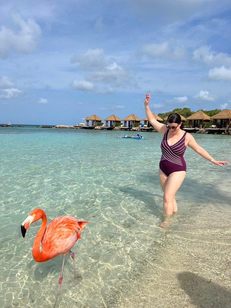 We got an early start that day, having our taxi take us back to yesterday’s vegan breakfast spot for takeout and then on to the boat, where we hopped right on and arrived to the island at 9am. We were greeted by a big pelican hanging out on the dock, unafraid of people. To the left was Iguana Beach, which we checked out first (we left a piece of cake there for a few minutes which got devoured by birds!), and to the right was Flamingo Beach, where the flamingos have a little area and like to stay. Kids aren’t allowed on Flamingo Beach except for one hour in the morning, making it a perfect quiet spot for us to stay all day. We walked on the beach and there they were, just chilling. They are not afraid of people, but don’t get close unless they feel like it. You can feed them little pellets, which felt funny with their hard beaks, and enjoy their chill company. A non-photographed moment for me included floating on a pool float in the perfect calm beach, and paddling myself over to a flamingo who was hanging out in the water, and just kind of watching each other for a while. It was dreamy. The beach day itself was also amazing, of course. We swam, floated, snorkeled, drank champagne, enjoyed both sun and shade under thatched umbrellas, and had lots of interludes with the flamingos. I knew it would be a bad sunburn day for myself despite near constant sunscreening, but I didn’t care, it was so perfect. We ate at the covered beach cafe restaurant for a sun break and I had an overly sweet bright blue cocktail that I would never order anywhere else. I also explored a little nature path in the trees but realized I wasn’t wearing shoes and turned around before going too far, and we got to watch the wild iguanas eat a big pile of lettuce put out for them. At the end of the day we cleaned up in the bathroom shower and headed back on the boat as the sun began to set. We walked around Oranjestad a little and ate dinner at a yummy Cuban restaurant. It was a little tricky to find a taxi back, which they told us was due to traffic, but we didn’t experience any except on the streets right by our hotel.
