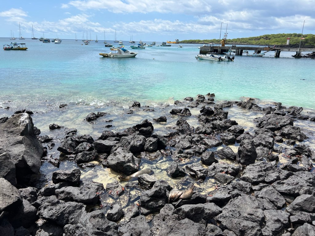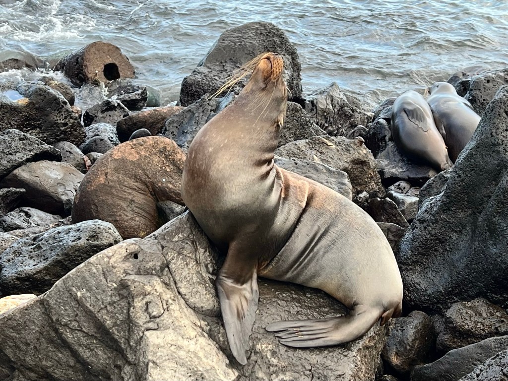 Paulina walked us down a block and a half to the water, where we immediately were greeted by lots of the creatures the island is most known for, sea lions. They hang out on the beach, lounging, rolling, fighting, and squawking. You can go onto that beach and swim with them! It was a very cool intro to the islands. Paulina walked us through the main touristic drag and pointed out some key spots, and then took us to eat at a little restaurant where I had a caprese sandwich and fries. The prices are much higher than Quito here, still less than NYC but comparable to some other American cities. We walked down the block to a gear shop, where we were fitted for fins, snorkels, and the optional short sleeve wet suit, which I opted to pay the $40 for solely to help with sun protection (I later find out the water is cool but very comfortable).