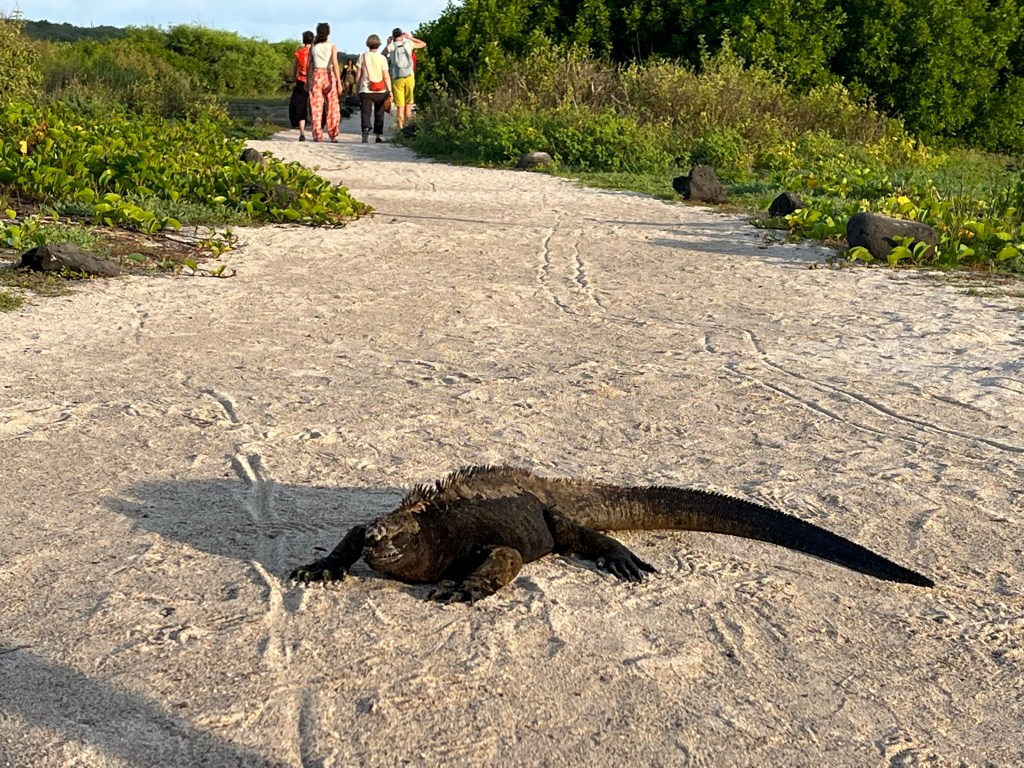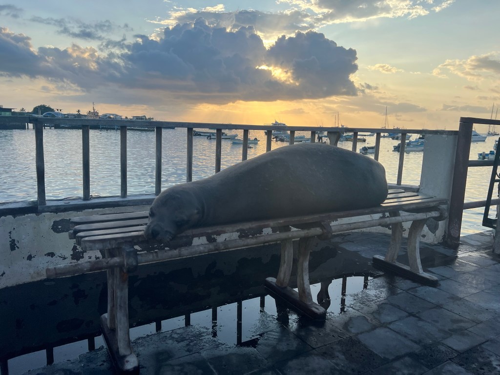 So back on the bus, a quick briefing about the next day, and we were sent off for the night. It was just about sunset and we watched a little from the balcony by my 3rd floor room. We all loosely agreed to meet up after our showers for dinner. We made it out and then formed a what’s app group to make life easier, though most had to rely on spotty wifi. Steve and Wendy weren’t ready and told us they’d go out on their own. So we walked down and repeated our daytime walk path, seeing so many more sea lions very close and in the dark lit by street lights. We got nice happy hour mojitos, then meandered before deciding to go back to the same restaurant as lunch. I had a chicken sandwich. There were probably 15-20 restaurants to choose from in town, at least that we could see, and just a few shopping stores and a market. It’s definitely a tourist island though there are some locals, maybe about 10,000, though it has been a while since the last census. The Galapagos have four inhabited islands where you can stay overnight, and the total population is just about 30,000. You can’t just move there; to live there you must have a generational connection.