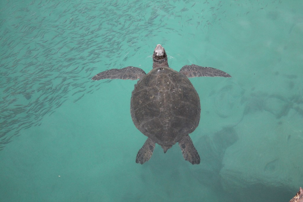 The bus drove us 5 minutes to Playa Loberia (sea lions beach), and a short flat hike in led us to a beach/bay for our first snorkel. It very briefly rained a little, so we stored our bags on hooks under a wood shelter, which a few sea lions were disinterestedly sleeping underneath. We were warned not to leave shoes on the floor or they might chew them. We stripped down and jumped in the water quickly. Everyone in our group had snorkeled before so we got in fast, leaving me struggling to quickly adjust my mask straps and figure out my waterproof phone camera case. I caught up quickly and immediately we were snorkeling through lava rocks and sea life. It was stunning with great visibility. As we got out to the buoys marking the breakers (where the surfers went), we saw our first giant sea turtle. I struggled to turn my camera on and then lost him, but then looked straight down and there he was, on the sea floor maybe 10 feet below me. Huge and chill! We saw about 4 of them in total! We also saw lots of reef fish, black with yellow accents; and baby yellow striped clown fish, some schools of small fish, and random other big ones. I missed the excitement and seeing two large white-tipped sharks, but was close to them. And then we saw a huge eagle ray, which was just weird and amazing. This was just our intro dive of about 40 minutes, and I felt full and in shock of how much we saw so soon. Lacking towels, we walked back in our wet bathing suits, stopping to see our first marine iguana right in the middle of the path. I see why they call them Godzilla-like; they are really weird looking.