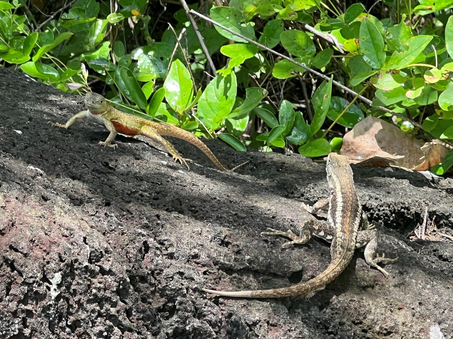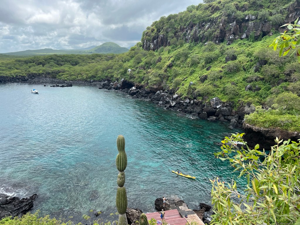 What an amazing day! The sun woke me up through the thin curtains around 6, and I snoozed a lot to make it to breakfast at 7:30 in the courtyard. Humidity and heat were already in full force. Breakfast was good, a plantain patty thing and egg and fruit. Paulina met us and we took a short walk to the interpretation center, just past a university building associated with University of Chapel Hill. The interpretation center was a good intro to the island, with an indoor museum-like display that Paulina took her time explaining to us to orient us to the Galapagos and its founding, including Darwin, its political connection to Ecuador, and the geology. It poured on and off while we were in there, and we decided to keep going into the rain with most of us prepared with raincoats. The next part was a little hike, on paved stones and some wood boardwalk. Though we got drenched the rain soon stopped, leaving slippery wood sections that I took very slowly. We walked to some boardwalk viewpoints of Darwin Bay, and learned about local birds, lizards, and more that we saw along the way. I was thrilled to see my first blue footed booby down below one of these viewpoints!