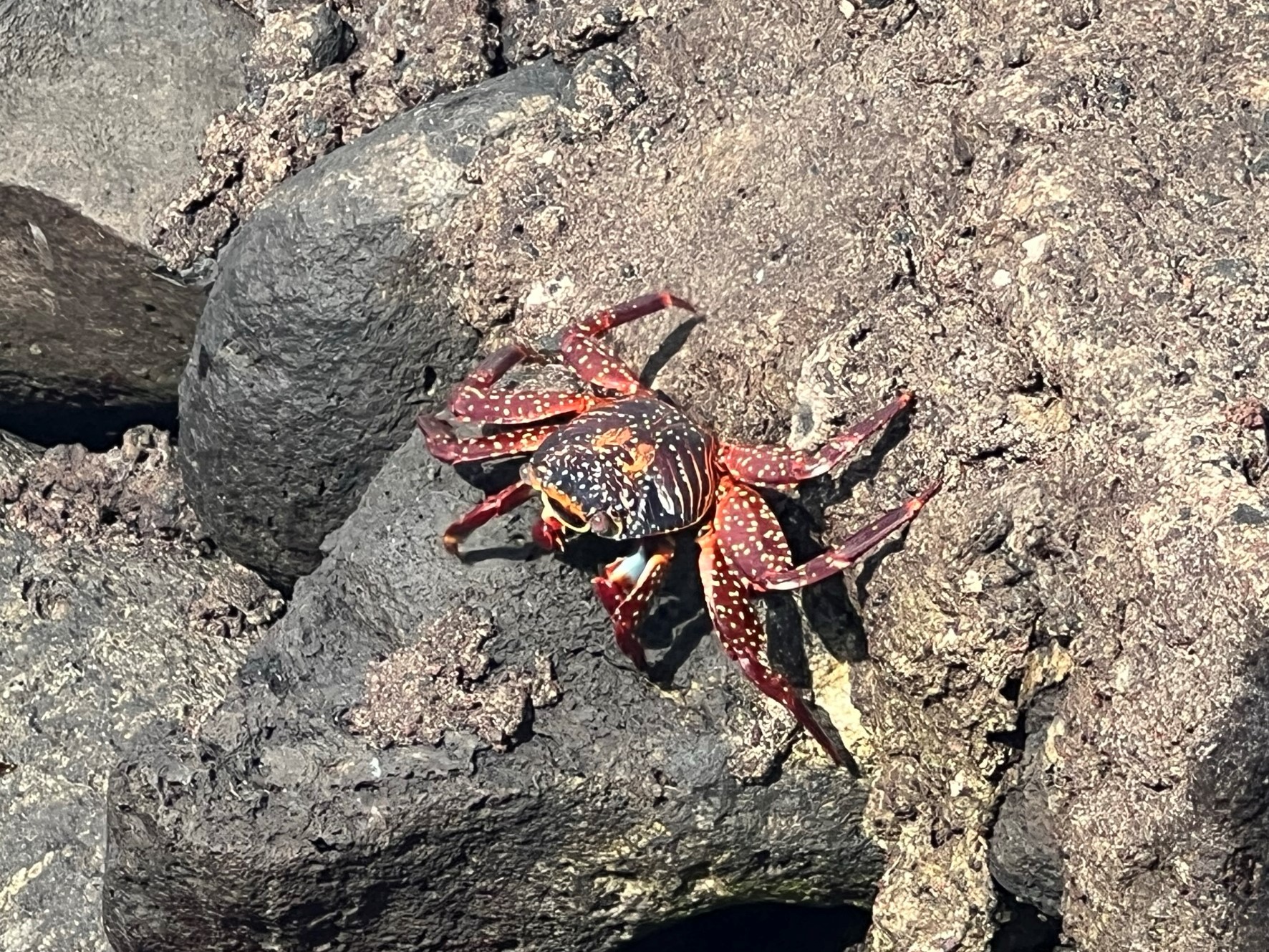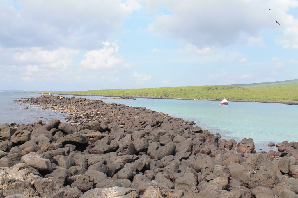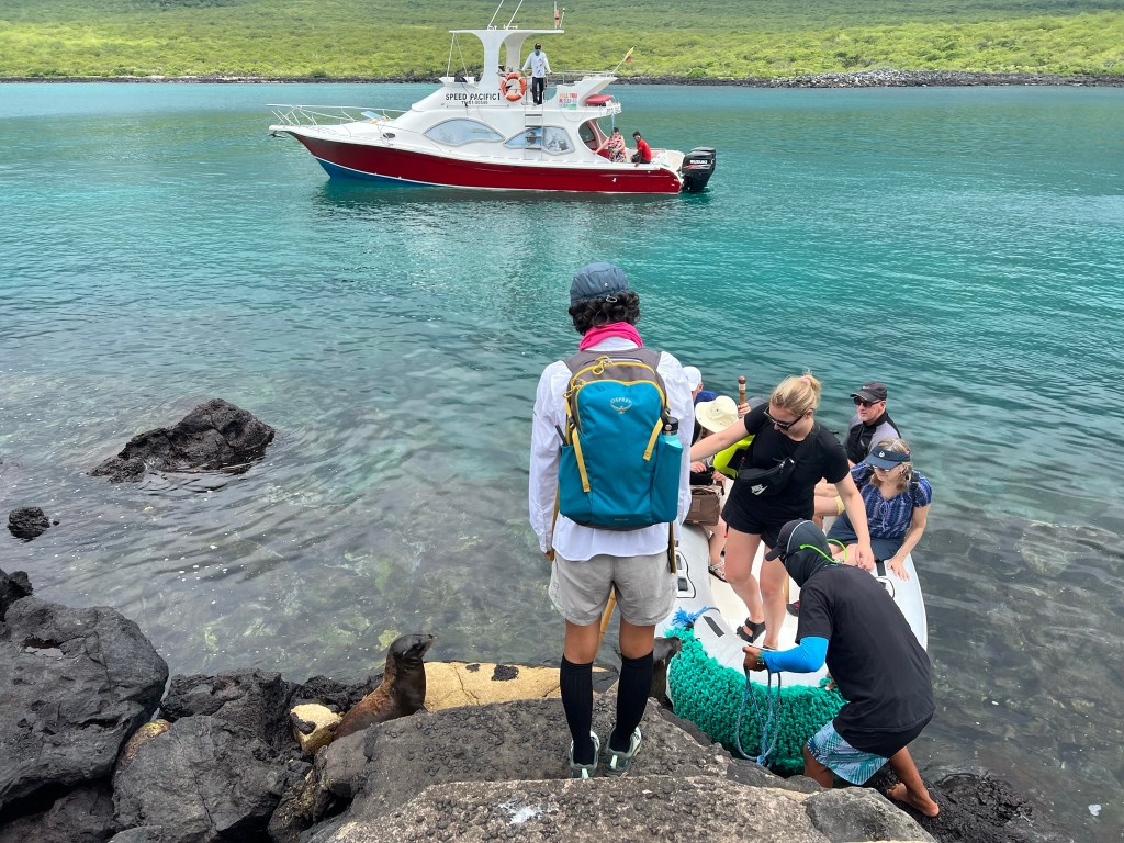 We walked back to the hotel for a quick change, then off to an included lunch at a local restaurant, rice and chicken and soup, that was pretty good. Finally around 1:30 we boarded our boat from the town pier, and off we went to Isla Lobos, a little island off the main one, further down in the undeveloped areas. Parts of the Galapagos like the national park lands are very protected, with rules around permits for visitors and requirements to go with a guide. Here, only two boats were allowed to visit per day, so we were the only ones on the little undeveloped island, no other humans or boats in sight. We boarded a dingy to take us to the shallow steps onto the island, which were inhabited by baby sea lions. We tried to walk up the slippery rocks next to the steps, but it didn’t go great for me as the first test person so we sort of clapped the sea lions awake and they moved for us, hopping in the water and splashing around. It was a very rocky hike, and I liked having the walking stick they lent me.