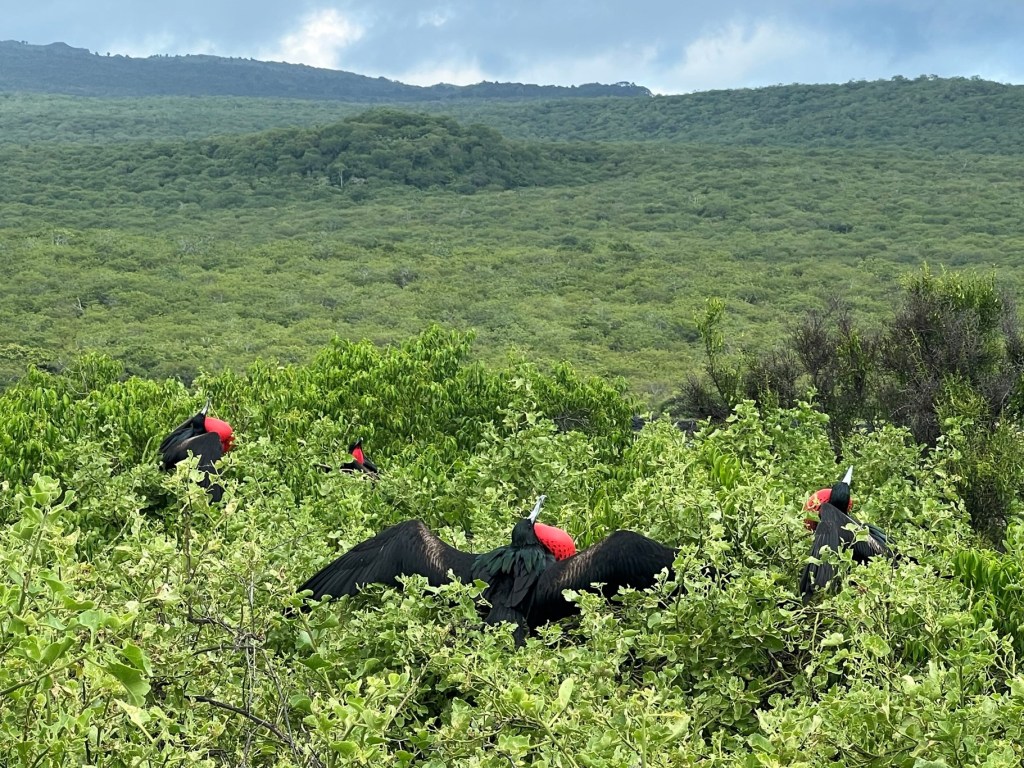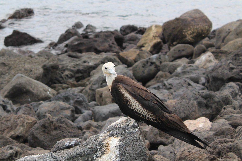 The island’s attraction were the birds. First, we saw these huge black and white birds, some with big red goiters (males). These were the frigate birds, who fly around the islands with their v-shaped tail feathers. The red-necked males sit around waiting for the flying females to notice them and choose one, and we got to see them look up and engorge their red goiters to try to attract the ladies. They were very weird and cool.