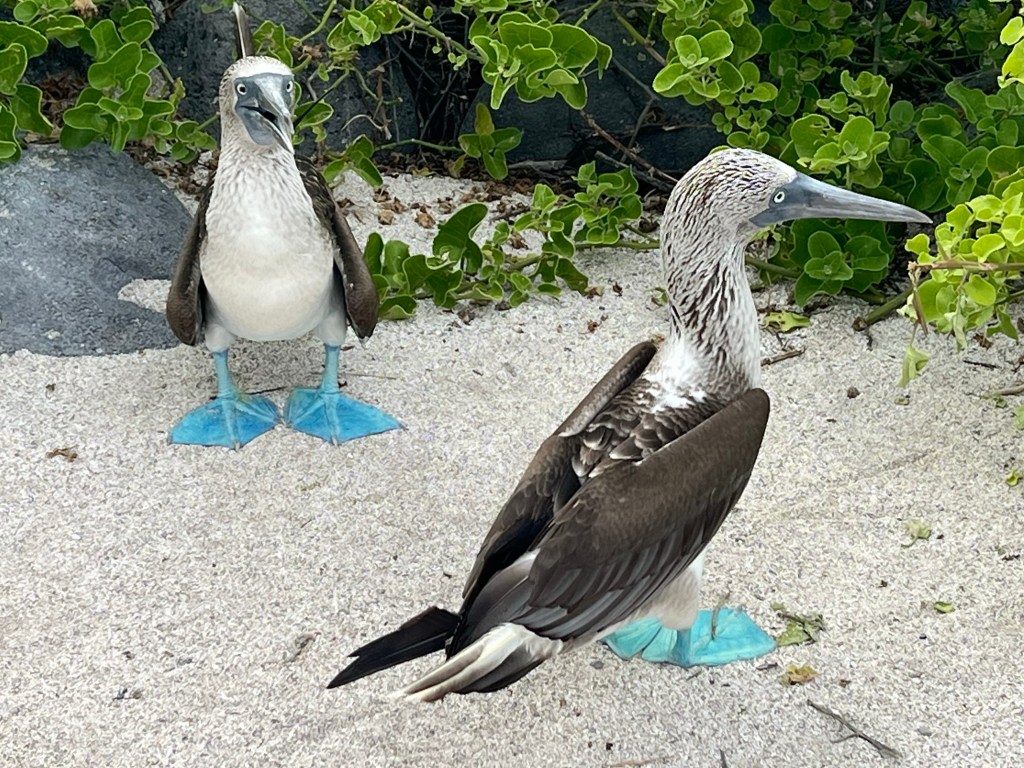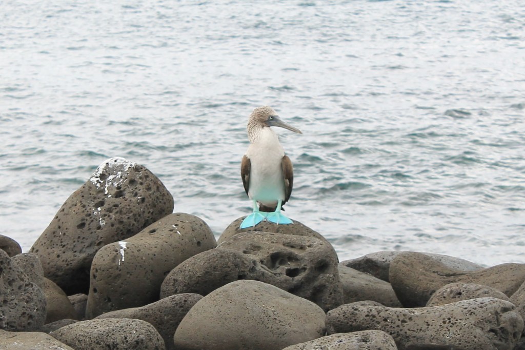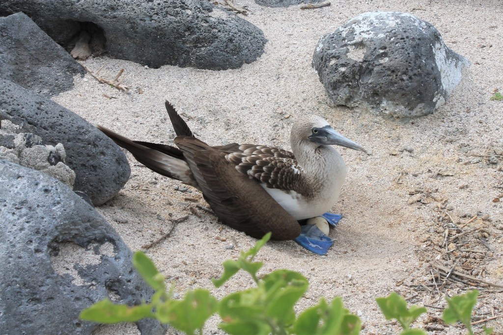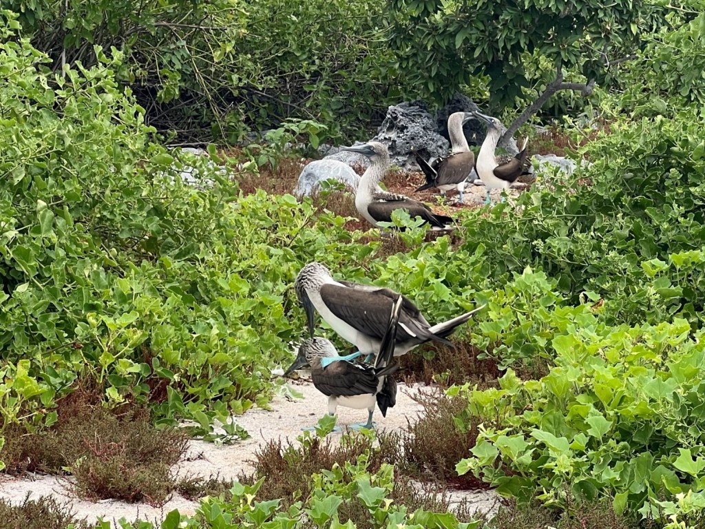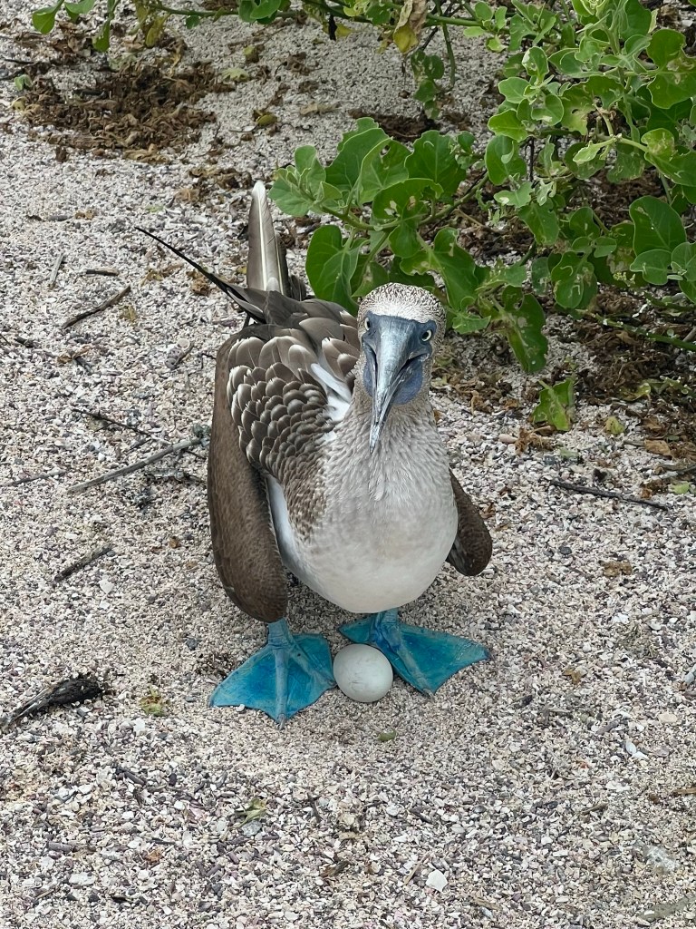 Then the exciting attraction for me, the blue footed boobies! I was super excited for these guys and we saw so many, often right on our trail so we had to sneak by so as to not upset them. We saw some doing a mating dance, and some nesting their eggs right in front of us (the males and females take turns with this task). Their feet change hues of blue based on how well they’ve recently eaten. They were so beautiful and cute and weird and I just loved them. It was so surreal to be the only ones on the island so close to these unique creatures.