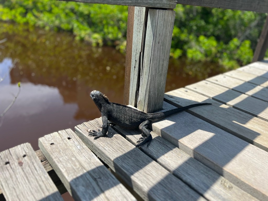 We then followed a trail from the center along some unique flora and fauna, like poison apple trees and mangroves. We were treated to a group of 4 flamingoes, hanging out in a pond under a boardwalk. They were young and lighter pink, and apparently the same breed as the ones I hung out with in Aruba. Cuties! The boardwalk ended with lots of marine iguanas, including a building that was decorated with climbing iguanas and fooled us into thinking they were real. We were able to walk back to town from there via the sandy beach.
