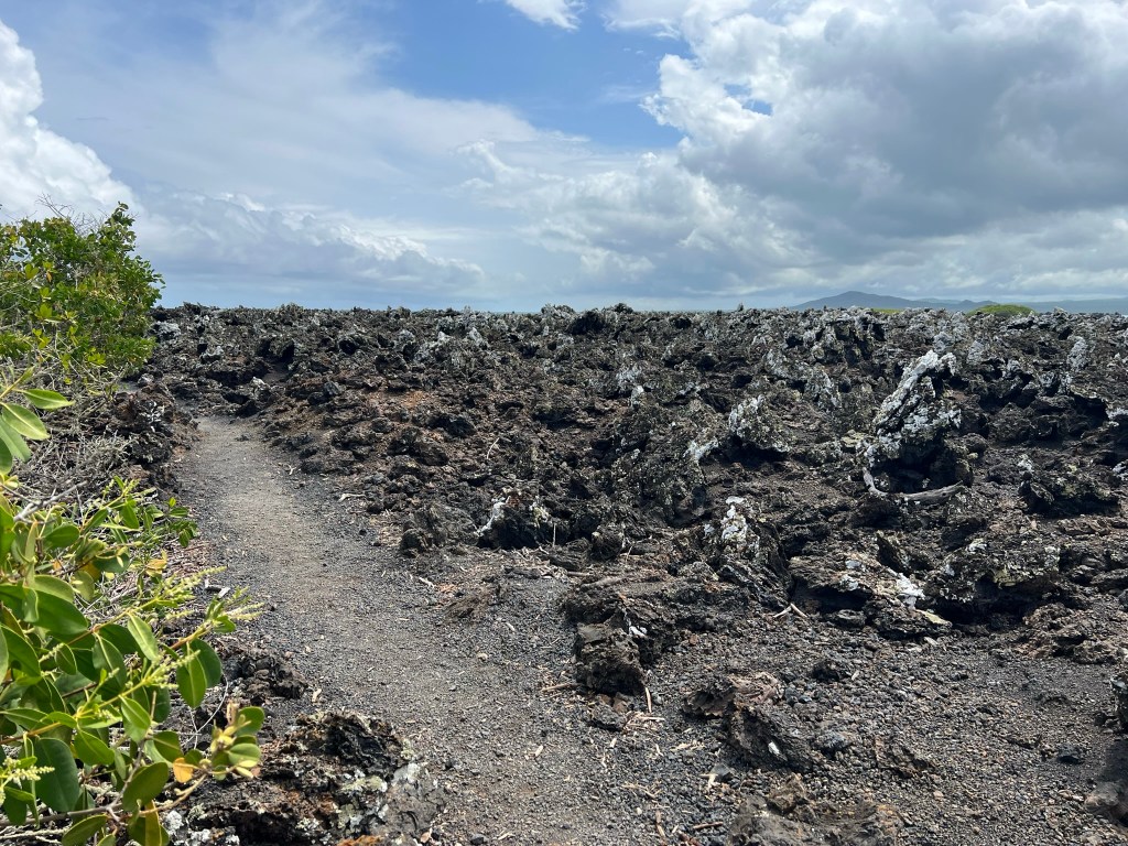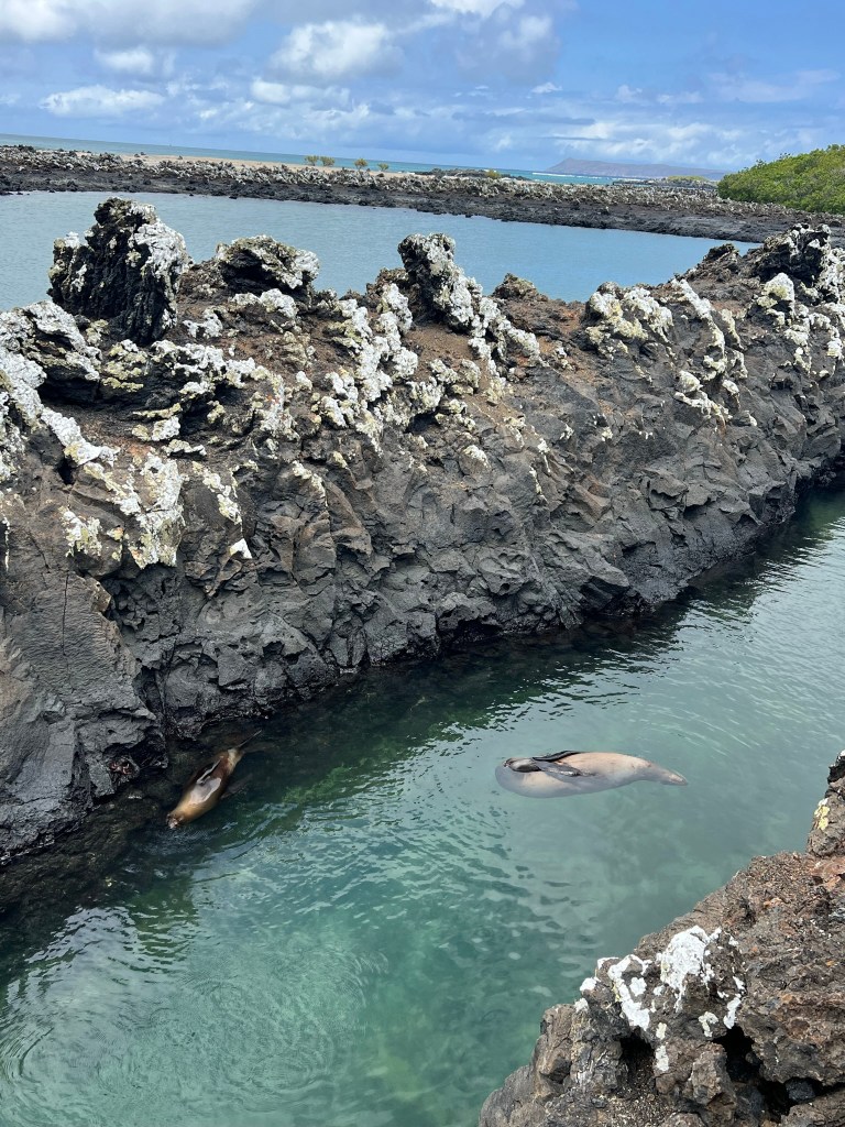 It was early so we went back to change, then some of us went to get lunch at a falafel place (the only one on the islands). It was good, and my plum juice was delicious (all the fresh juices here are amazing), but we ended up having to rush back for our 12:45 meet up. We took a bus to the pier and boarded a small boat, which took us around some islets where we saw cool rock formations and some blue footed boobies hanging out. We disembarked for a short walk through some lava fields, with very unique lava rocks and colorful lichen on them, feeling very much like being on another planet. Parts of the trail were closed for marine iguana nesting. A little canal under a boardwalk is a spot where there are often white tipped sharks, because they have to constantly move to breathe and the canal lets them rest while still flowing a little. But we didn’t see any. We ended at a little beach and watched some sea lions, then headed back onto the boat. We got into our snorkel gear quickly, and jumped off the boat for another round of snorkeling. The visibility wasn’t as good today, but I saw a sea turtle, a sting ray, and lots of big parrot fish – including an iridescent green and blue one I especially loved. The goal was to look for sharks, and 3 people in our group saw one but I did not. It felt crazy that we were swimming around trying to chase sharks, no fear and just fascination.