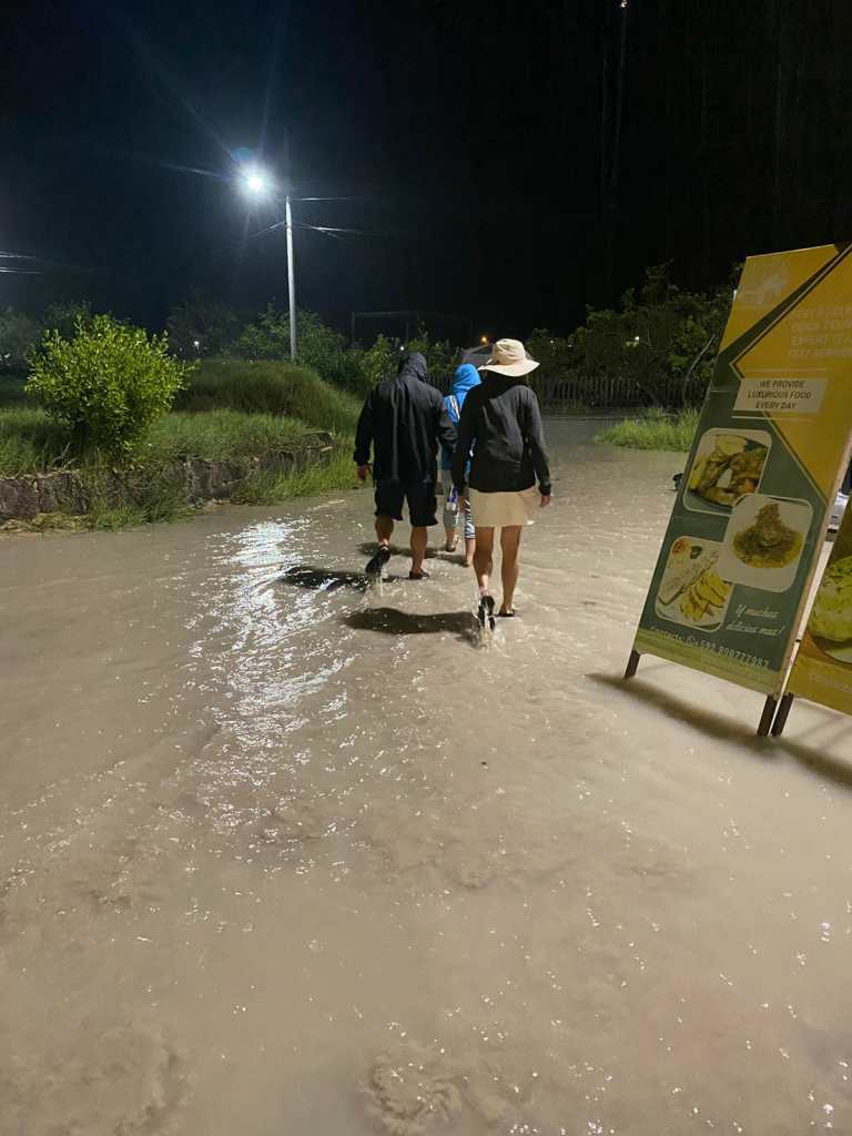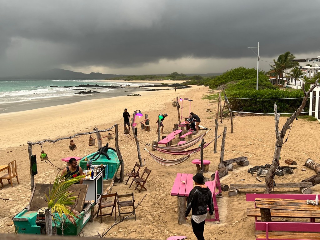 The night ended in one of those spontaneous travel adventures that you never expect but always remember. Back from another excellent day of adventuring, it started to rain as we got ready to leave for the beachfront bar for happy hour and sunset. Instead of passing as it usually does, it started pouring, and instead of clearing, it ended up storming intensely all night. When it was still light out we walked to the bar and brought drinks up to the covered rooftop area, where we saw marine iguanas hanging out and climbing around the walls onto a little platform for them. The rain picked up and sunset was a bust, but we huddled in a corner to avoid the wind pushing the rain into us, enjoying our mojitos and chatting. We finally went back down and found a covered area without wind, and hung there around other people in the sand enjoying another round and fun conversation. We finally decided to make our way to a restaurant Paulina said was close, and it entailed sloshing through ankle-deep muddy puddles that had formed in the street. We were a few drinks in at the restaurant and were having a great time on the covered porch, me being judgmental of non-NY pizza (it wasn’t that bad). On the walk back I whipped out the umbrella, as I was the only person with one, and really enjoyed it, despite soaking ankles. How fun!