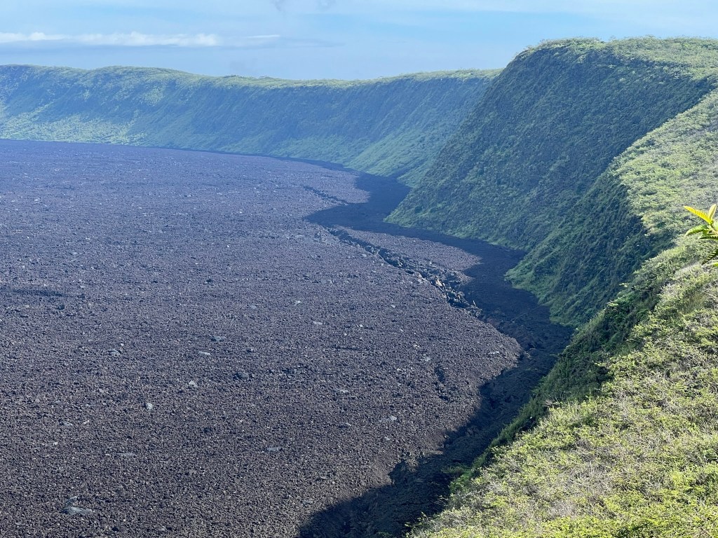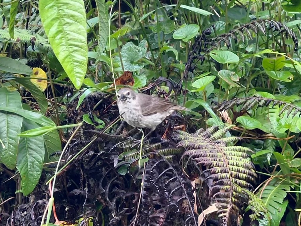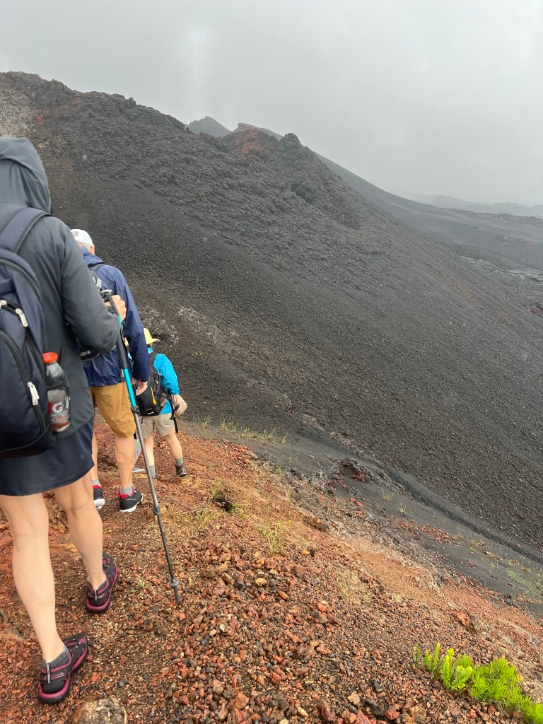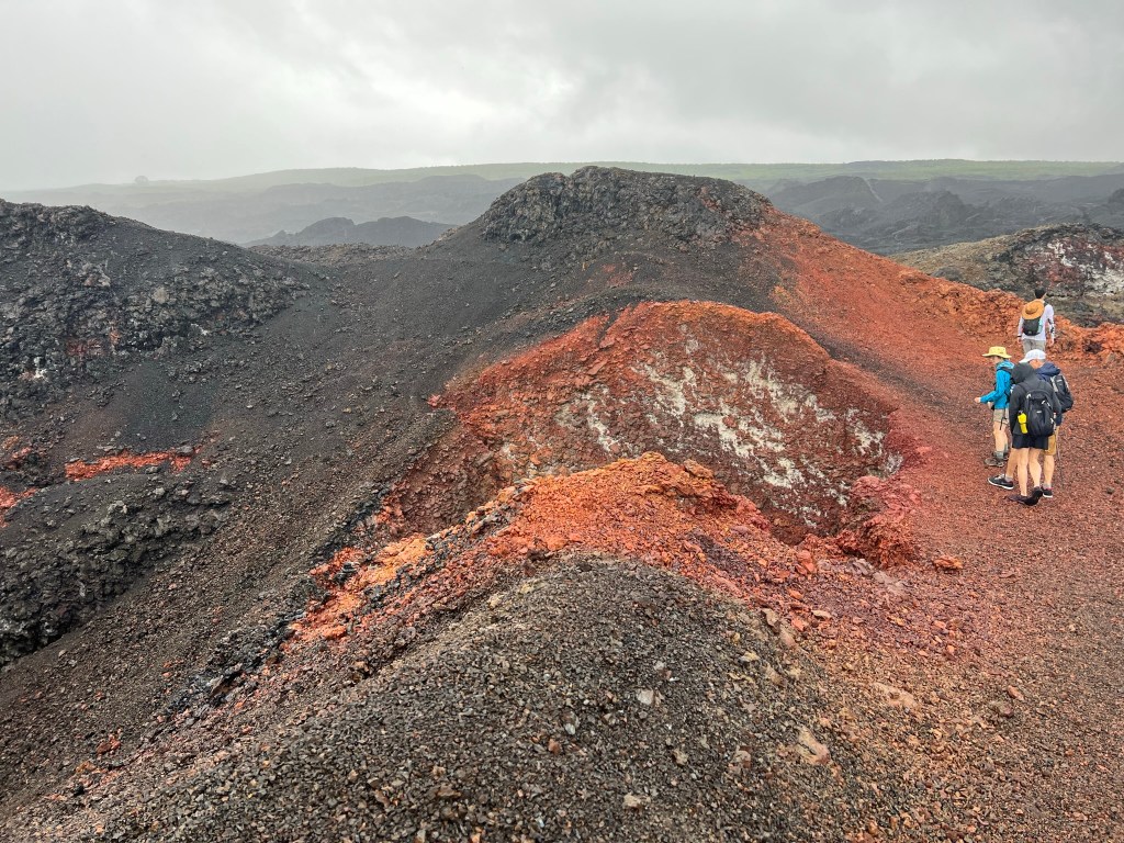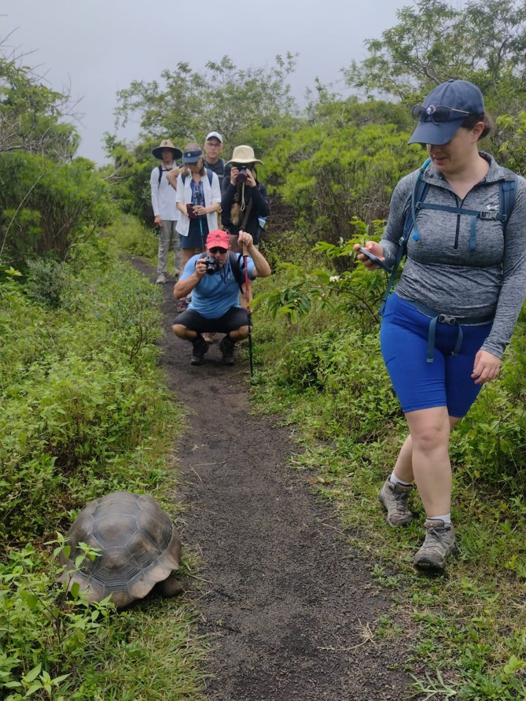 Volcano hike day was a day to remember, for sure. We completed about 10 miles, in 6 hours. The elevation gain wasn’t too bad, and half of it was pretty smooth while the other half was rocky. The real issue was the rain! After a leisurely climb up a gravel path where we took breaks to look at birds and such, we made it to the first viewpoint of the caldera of the Sierra Negra, one of the largest active volcanos in the world. It last erupted in 2018, and 2005 before that. It was huge, you couldn’t really see the whole thing at once. It was essentially a big crater with lava rocks inside. It reminded me a bit of Crater Lake in Oregon but instead of water it had rocks, and we saw a few small steaming fumeroles in the distance at one point. The trail leveled out for the next hour or so, minus some puddles that we walked around through the grass. We saw some cows and horses on the trail. The vegetation was very lush with ferns, fruit trees, and more. We arrived at somewhat of a midpoint of the one-way (1/4 of the hike), a covered shelter with benches next to another amazing viewpoint. From there, we saw another group and decided to book it to the next downhill section – the hike is very heavily permitted with limited numbers per day. A bit down I was toward the front and Paulina stopped short – we saw a wild giant tortoise on the side of the trail! Apparently very uncommon there. A little more into the gravely hike down, as it started to level off, the rain started. We were all decently prepared so it wasn’t a big deal especially after last night, but then it just didn’t stop, and ended up lasting almost the entire rest of the hike, minus the last mile or so. It was a little miserable, and my waterproof rain jacket finally failed me after about 7 years. The waterproof hiking boots were ok but the rain was so heavy it just fell into the sides. We were all drenched. The backpack surprisingly did ok, though at the end of the day my money was wet and a few other things too. That being said, the landscape was beautiful at the last bit of the out-and-back. It was essentially lava flow formations, with lava tubes and colorful lava rocks and some cacti, very other-worldly. The final viewpoint we were able to see a little bit but not great; normally you can see the whole island. We were 5 of us hiking plus Paulina and our assistant Tito – Wendy and Fiona didn’t join due to injury. We took the 40 minute taxi ride back, feet burning and backs aching, advil flying around the van. We got back around 2pm and spent the next few hours just lounging and doing nothing. It hadn’t rained at all during the day in town, but naturally it started to rain late in the afternoon. Paulina did our briefing and we walked to get drinks and then dinner, drinks at the veggie place from the other night and dinner at a local spot where I got pesto pasta. My feet are still burning, I definitely overdid it a bit despite my boundless energy. Tomorrow, we kayak in Isabela before heading to our next island, Santa Cruz.