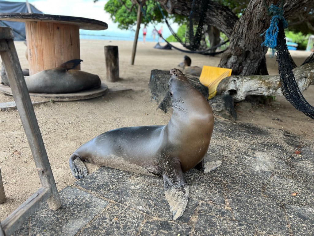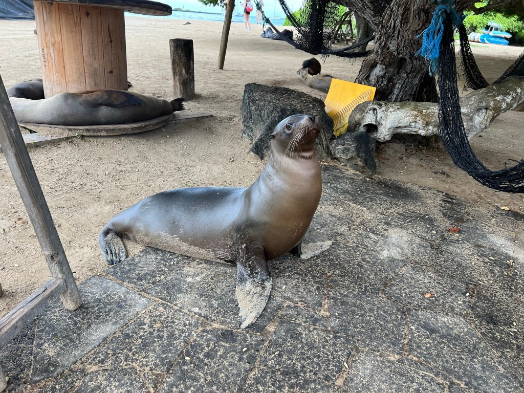 Another excellent day in the Galapagos! After breakfast we loaded our bags, went through inspection, and the team loaded up our boat while we went to the beach for kayaking. I sat in the front of a double with Steve, who was paddling very aggressively, riding waves and getting ahead of the guide a lot. I didn’t have to work much and it was lovely, I love kayaking. We saw some sea lions (and raced with one!), a sea turtle, some frigate birds up close, and more, plus lots of the same cool lava rocks near where we had been two days before. We briefly jumped in the water back at the beach, walking up to a sea platform with sea lions to say hello, and back on the beach hung out with the sea lions and marine iguanas a little. We did a quick change in the bushes and onto the boat we went, via water taxi, to our next stop 2 hours away in Santa Cruz.