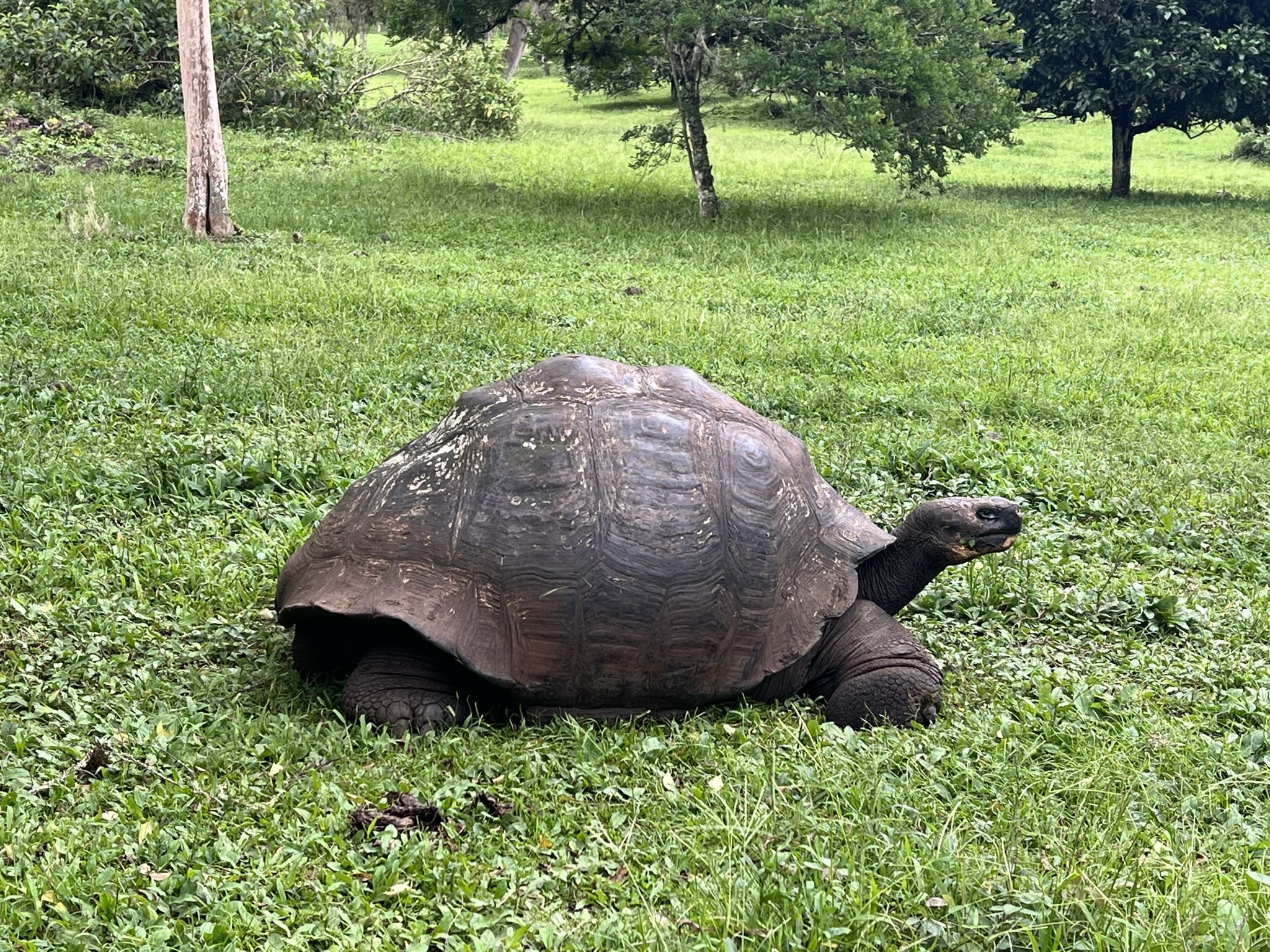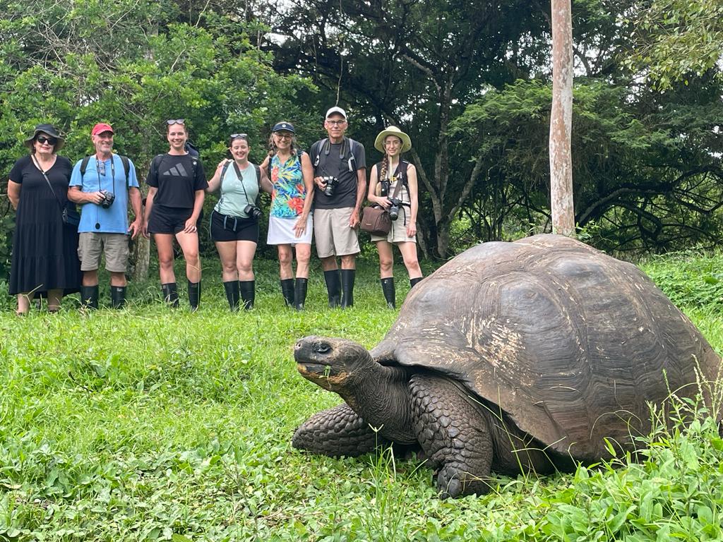 We drove out of town, past a little suburb, and onto a well-paved straight road for about a half hour before turning into a dirt road, which took us a long way down to Manzanilla Farm. We saw about 20 giant tortoises along the road on the way there, plus small Monarch butterflies, cattle, and lush vegetation. Tortoises are protected to roam free on this island, and they love going to this farm, where they stroll around, eat grass, meet up with friends, etc. We had a delicious lunch in a somewhat fancy hall, then put on gum boots to go explore through the grass to look at the tortoises. We didn’t have to walk much and we saw many huge ones! They mostly stood still, and we worked to maintain about 3 meters of distance between us so we didn’t scare them. We saw some in a pond with green algae, and then a big male start pursuing a female. She tried to run away in a tree with branches toward the ground, and they both got a bit stuck. She got out, and a few minutes later the male crunched through the branches to keep going. When she went in the water it was neutral territory and he gave up, for now. We learned a lot about them and it was nice seeing them so close!