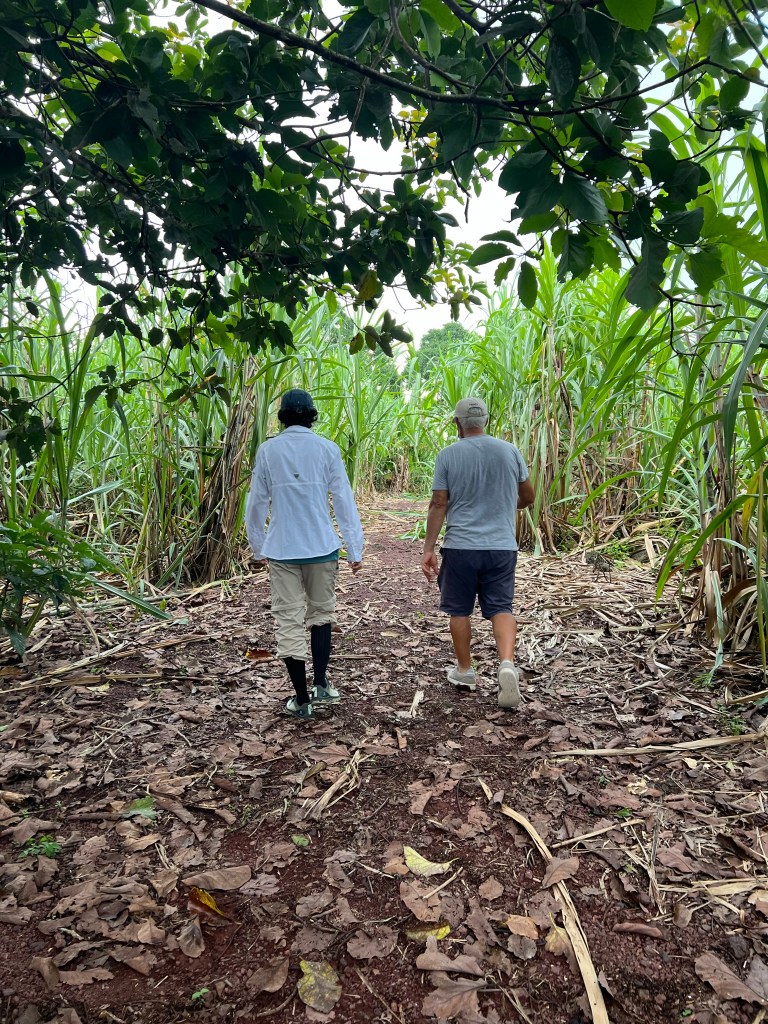 Before we left, we went just up the road to a sugar cane and coffee farm and got a private demonstration from one of the owners (since 1968!) on how they made sugar cane juice, a liquor out of the cane, and coffee before there was electricity on the islands (not til 1975!!). We tasted lots of yummy samples. Andy and Steve volunteered to push around a big stick to help crush the cane into juice, and we walked through the beautiful cane fields. Some of the products were for sale back at the farm store, but today this spot focuses mostly on tourism. The owner saw Paulina’s shirt with her full name on it and it turns out he served with her grandfather in the military a long time ago! This was a fun excursion.