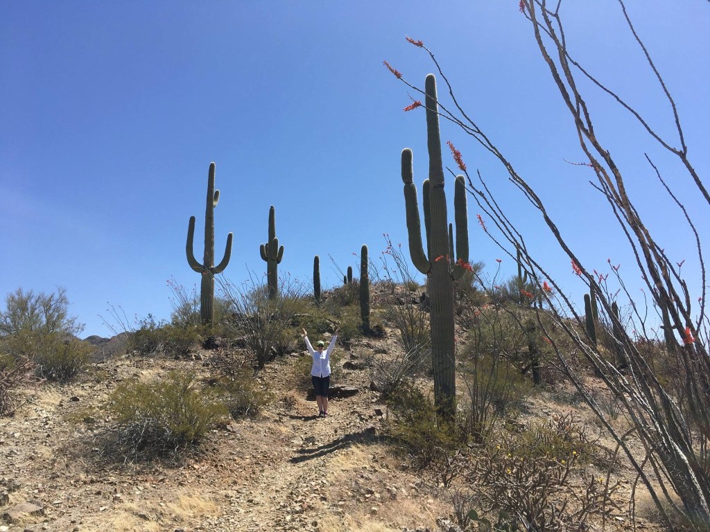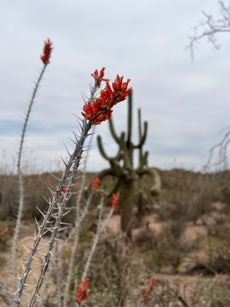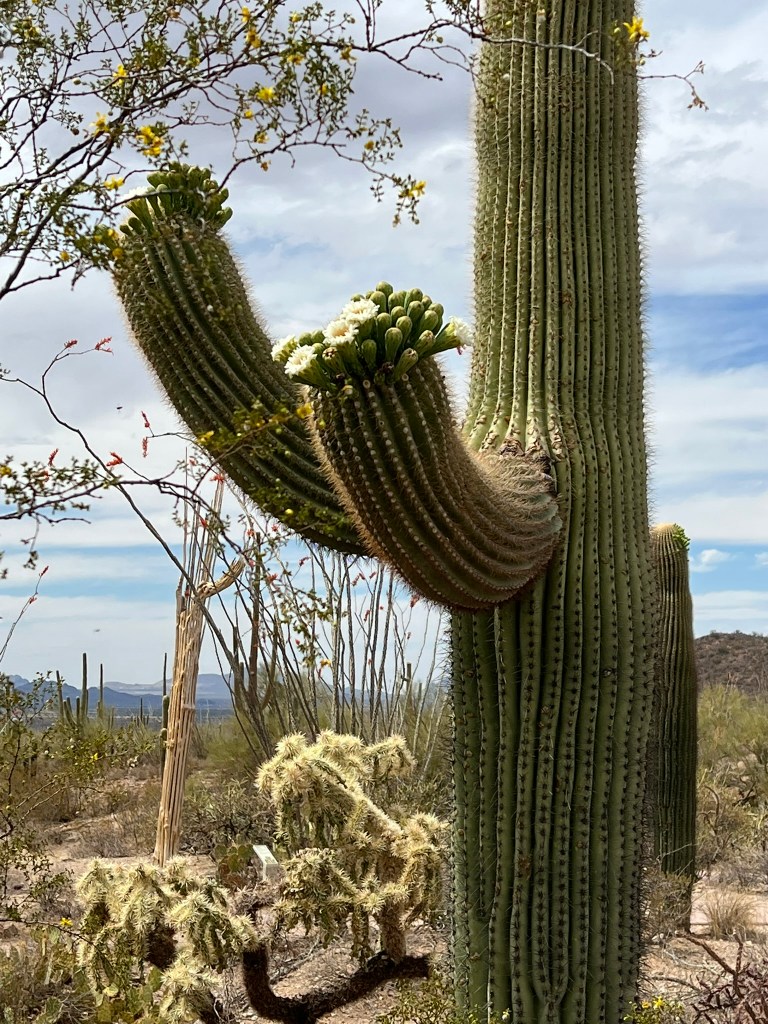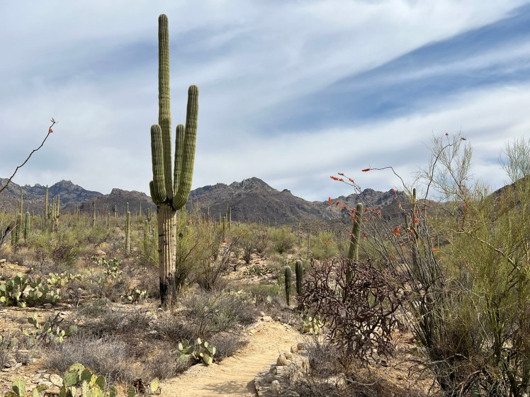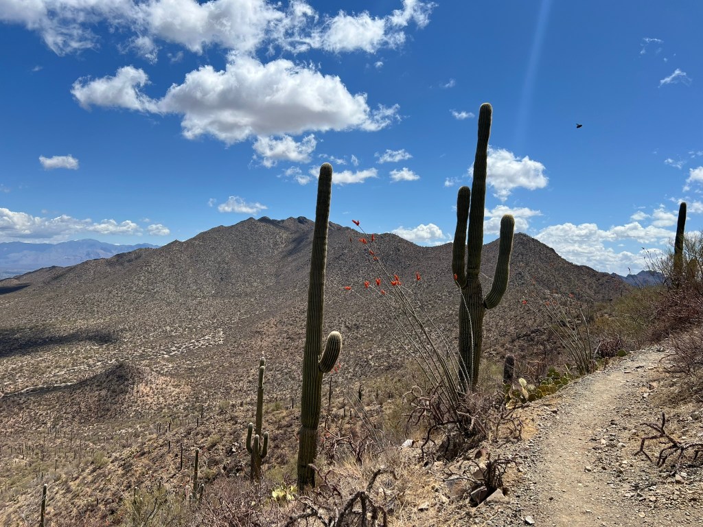 I kept going back to Saguaro National Park (the west and east park districts sandwich the city), reveling in the blooming saguaro cacti and ocotillo and the quiet I found so easily on the trails. My last day in town was my planned longer-hike, a returning favorite called the Sendero Esperanza (hope trail). The trail goes up to a ridgeline where you can decide how much more to walk in multiple directions, and I ended up walking much further than planned – just around that bend, just over that incline. Going further than planned was definitely a theme.