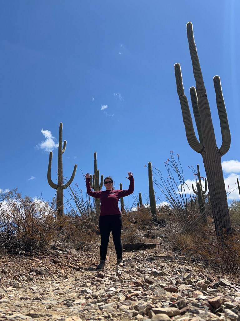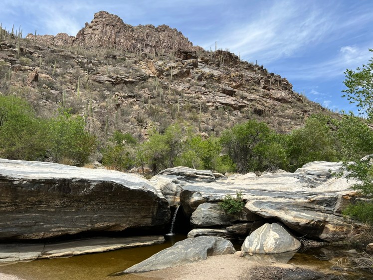 It was my fourth time in Tucson, so I was excited to return to some of the hikes I had done before, though on each trail I found new ways to explore and make them feel new and exciting. I kicked it off in Sabino Canyon, a local favorite spot where I felt my first of many little bursts of joy at using my annual National Parks pass. After a warm up hike of about an hour to see how my foot was doing, I took the open-air narrated shuttle bus into the canyon with the traveling seniors and families, reminiscing about an amazing full-day hike I’d done in the area the last time I’d visited. I took the driver’s advice to hang out by a dam on the way back, which was more like a little watering hole with a small stream flowing into smooth rock. I explored around the rocks a bit, until the water called to me and I went in up to my belly in my shorts, letting the cold little waterfall splash into my hands. The desert air dried me off quickly as I ate my lunch and reveled in how different today was from just 2 days ago. I still felt the tension in my shoulders and the stress was still there, but I was very aware of how different I was already feeling. Travel is magic.