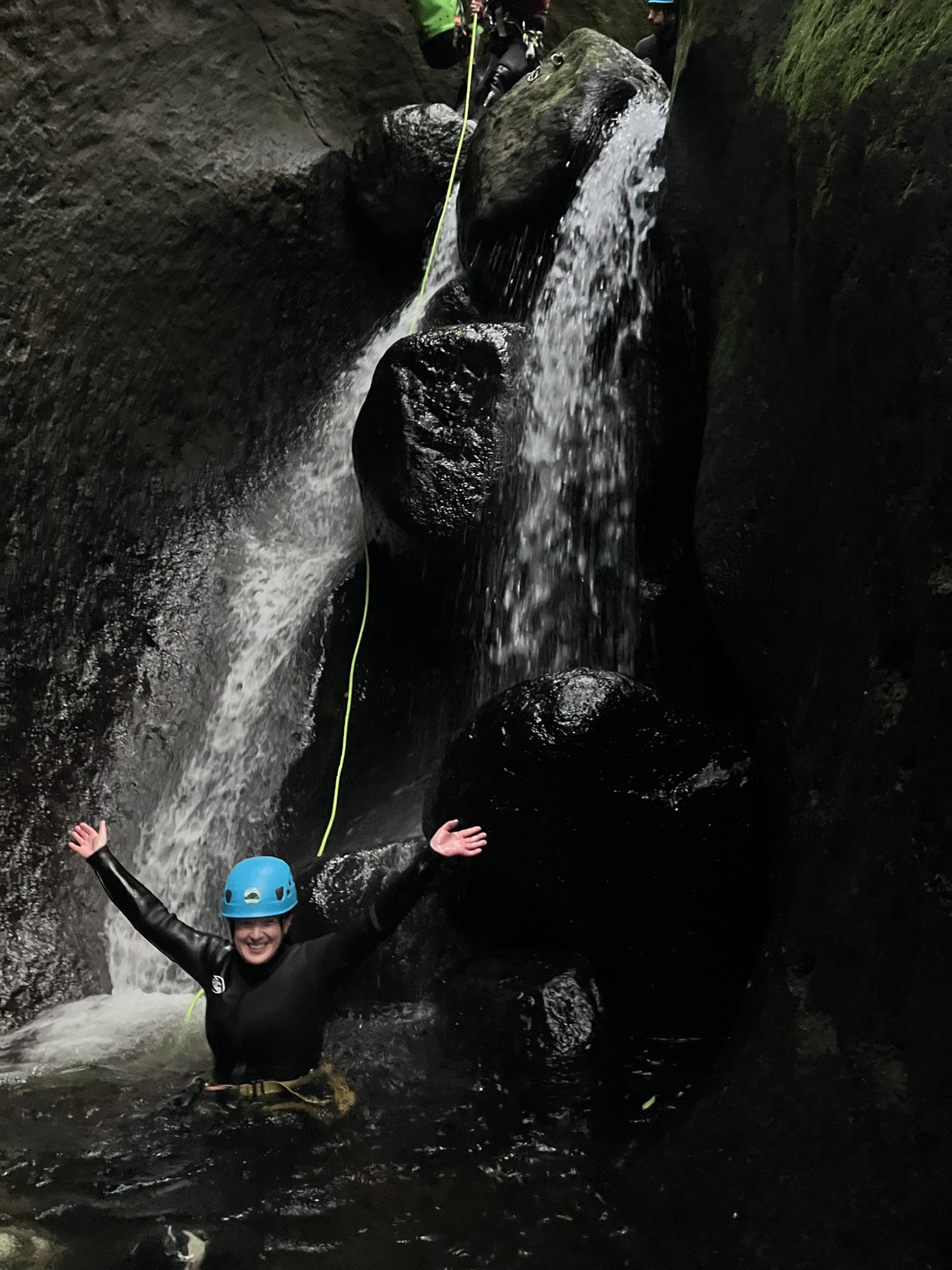 The group was just me and 4 guys from Spain (3 brothers and a friend), with two guides. We geared up and got ourselves ready for the adventure, this one much more primitive and isolated than on Sao Miguel, though when we left we did see one other company parked there. We hiked up into the canyon, got a safety briefing, then did a rappel “test” where we practiced the technique on a short hill. It was helpful to learn that you are supposed to use your full foot and not jump down like at the climbing gym. Then right away, off we went! We did several rappels, the longest one 18 meters high. I loved it! I was getting the hang of it as I went, though there was some swinging and a little falling/hitting body parts on rocks, but nothing serious, and everyone kind of did that too. The hardest part for me was once again the high jump, about 10-15 feet, and we did two of them. The second one really messed with my ears when I was coming up from underwater, and they’ve been bothering me all day as I try to pop and pressurize. They’re getting better and it may take a few more days, but fortunately I’m not flying for a few more days. I remember this feeling from diving in Australia. Anyways, the experience was amazing. I felt so full swimming through the cold water under the isolated waterfalls. We hiked back, including some challenging scrambles, and detoured to a gorgeous coastal viewpoint where the guides gave us cheese and honey sandwiches and water bottles – perfect!
