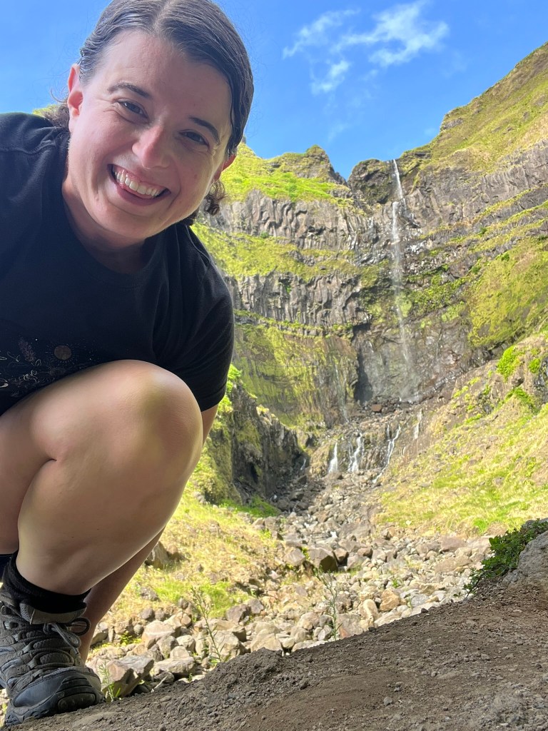 I got back to the hostel a little after 6pm. I was starving but managed to shower first, then dinner at the Indian guy’s food truck next door. I’m not usually a fan but the veggie dish was delicious with a nice beer. And then, despite my tired body and legs, I went for a stroll, which ended up being about an hour of walking into the sunset, including near the Poco do Bacalhau waterfall in town. I ran into two of the roommates separately at the sunset ocean view area. One had just been at the waterfall and mentioned you could swim under it, so now I have my plans for tomorrow. Tomorrow – a day that WILL BE MORE CHILL. I’m hoping to skip a big hike and just see viewpoints, but we’ll see. Thank you for letting me experience your paradise today, Flores!
