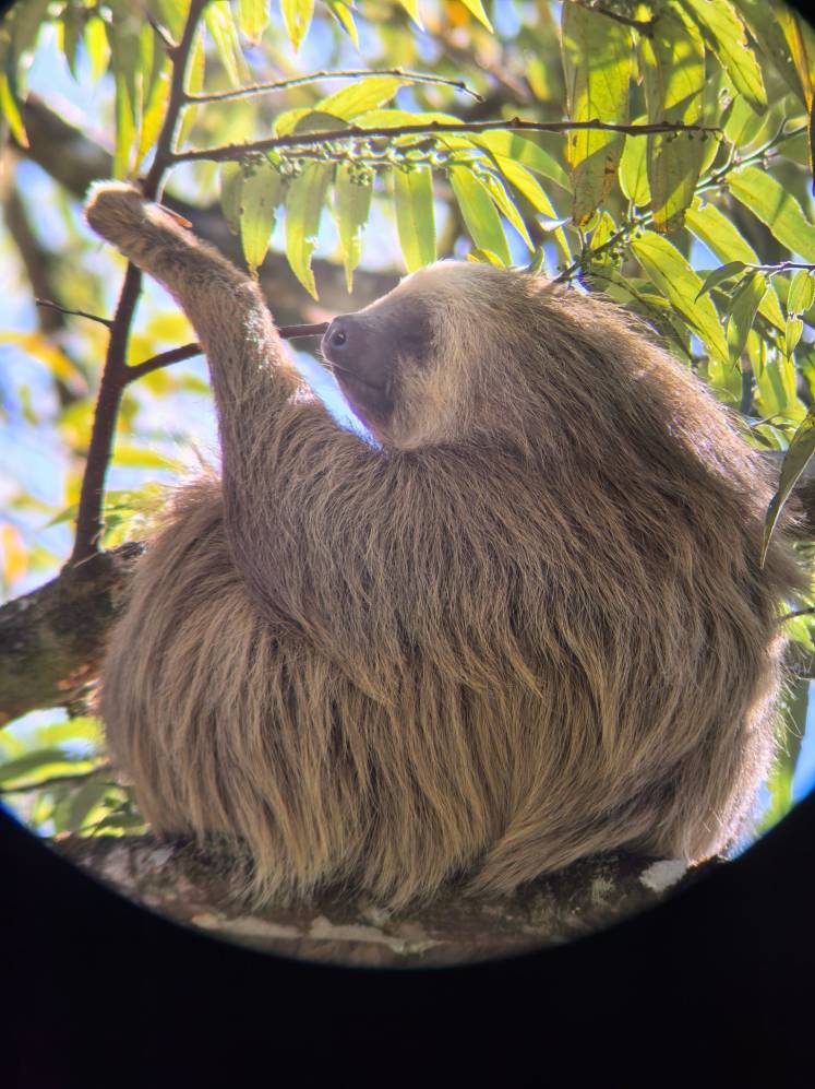 Javier had a fancy telescope that allowed you to attach an iPhone for super-zoomed-in views, and we all gathered around to see, so we could see details like the dark eye stripes and long toenails. But even without the zoom lens I could see the sloth, who was moving across a branch about 20 feet up. I was surprised by how fast it was moving, exposing its long arm reach and skinny, furry torso, the sense of determination visible even from afar.