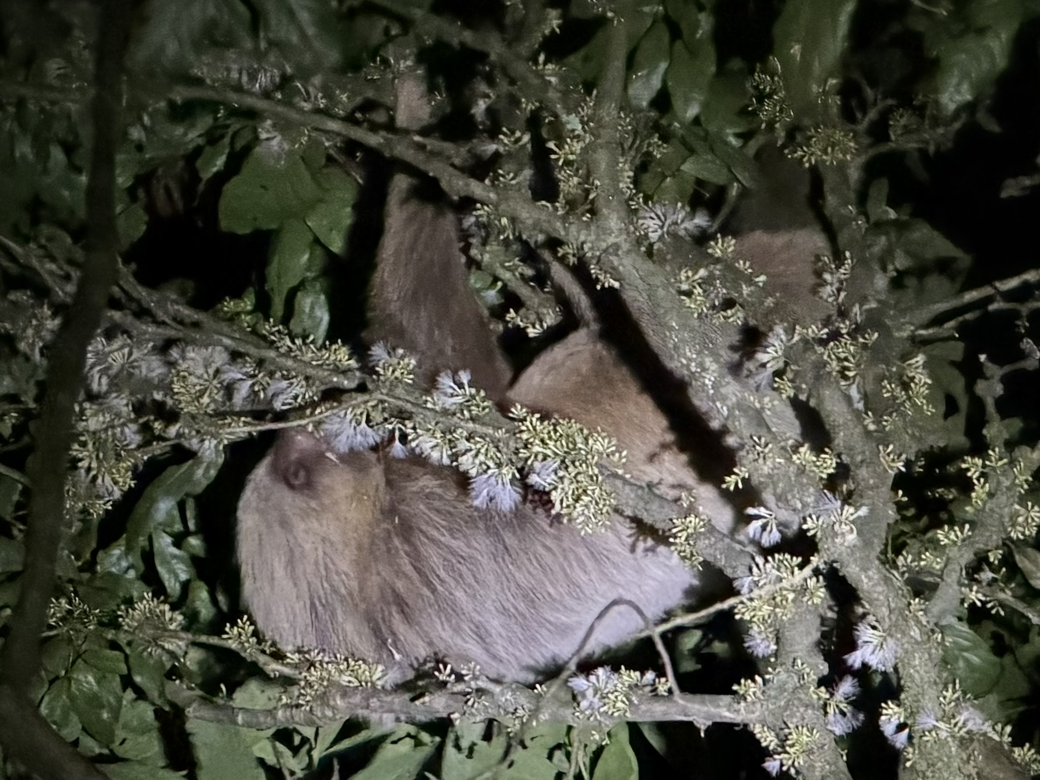 In the Monteverde cloud forest, we went on a night walk, with our guide Fabian identifying lots of creepy crawly animals like scorpions, tarantulas, and a snake that he identified as “only poisonous if you are allergic to it,” which did not lend much confidence. We also spotted a racoon and several snoozing toucans with bright yellow beaks. And then, his flashlight shone on a large, fluffy sloth next to our trail. This one was moving around a little and eating something, and was a different kind of nocturnal species.