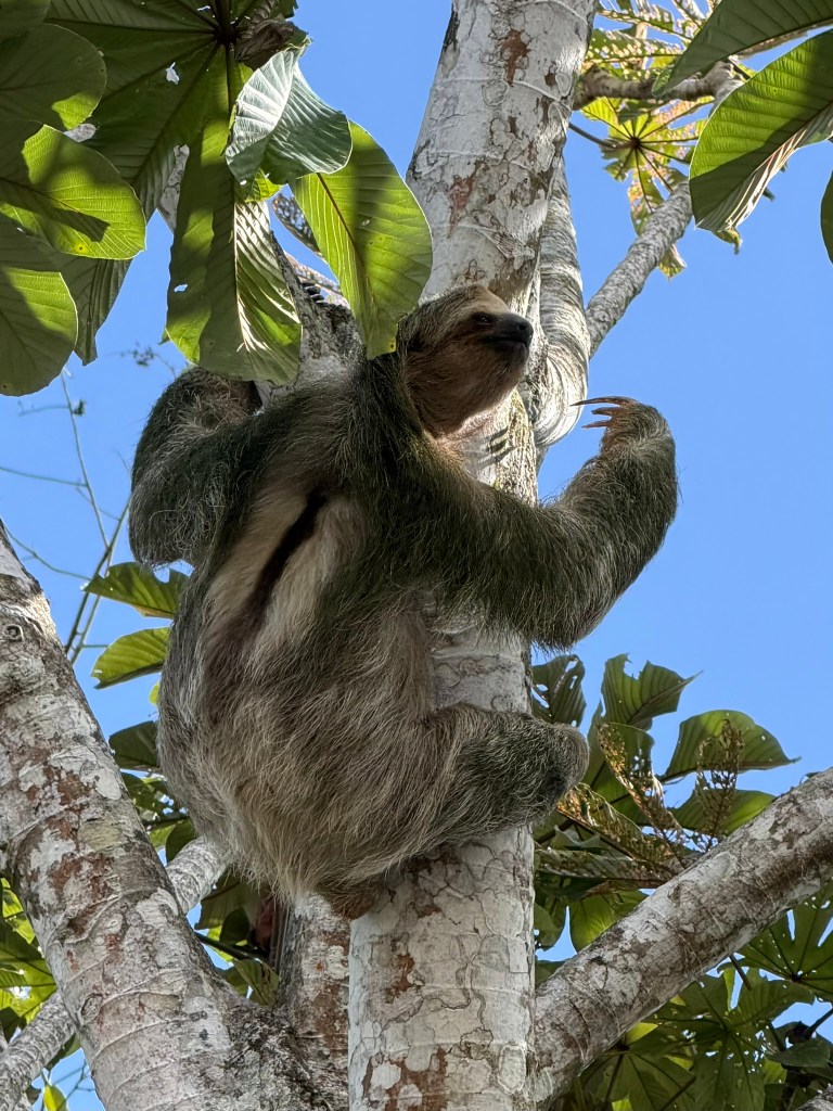 Javier shared some sloth facts with us, distinguishing between two- and three-toed species and noting that most are female. They’re also pretty solitary, keeping to their own territory. The fact that most stayed with me: sloths generally stay up in the trees to evade predators, but they’ll come down to the ground about once a week to poop!
