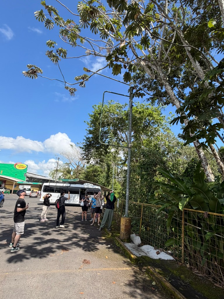 Following the lead of other cars, we pulled the van over to the side of the main road at least 3 times to get out and look at sloths in trees on the side of the road, not worrying about the traffic backup we were contributing to. They were a little hard to see, but at one of the sightings, Kate from England let me borrow her trusty binoculars. I was grateful, because that one had a baby with it!