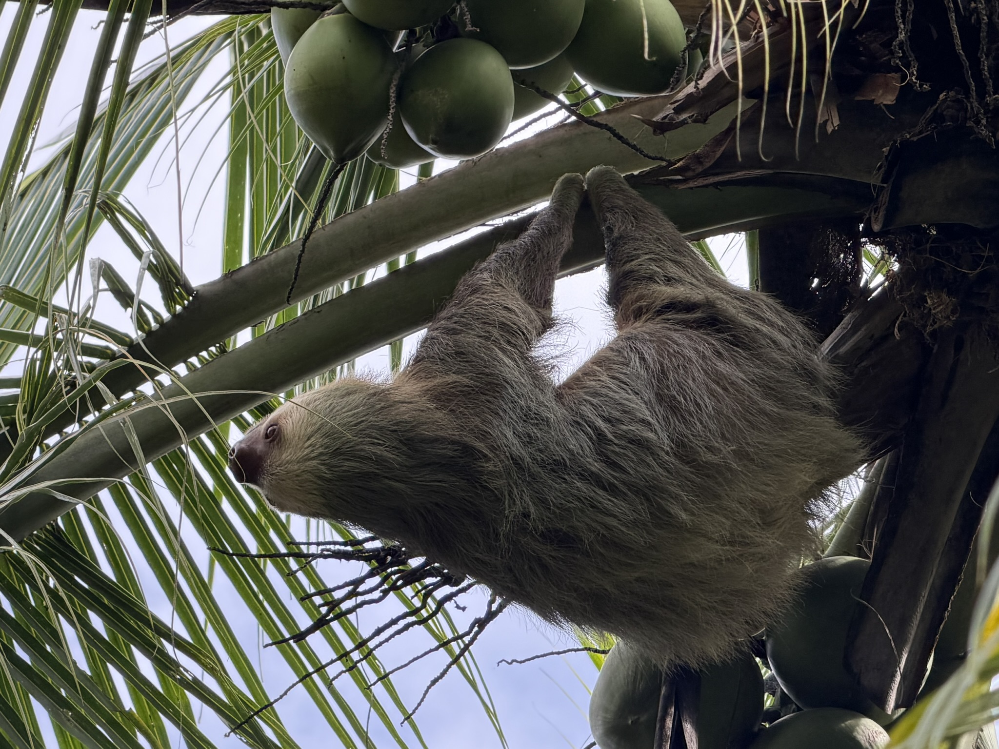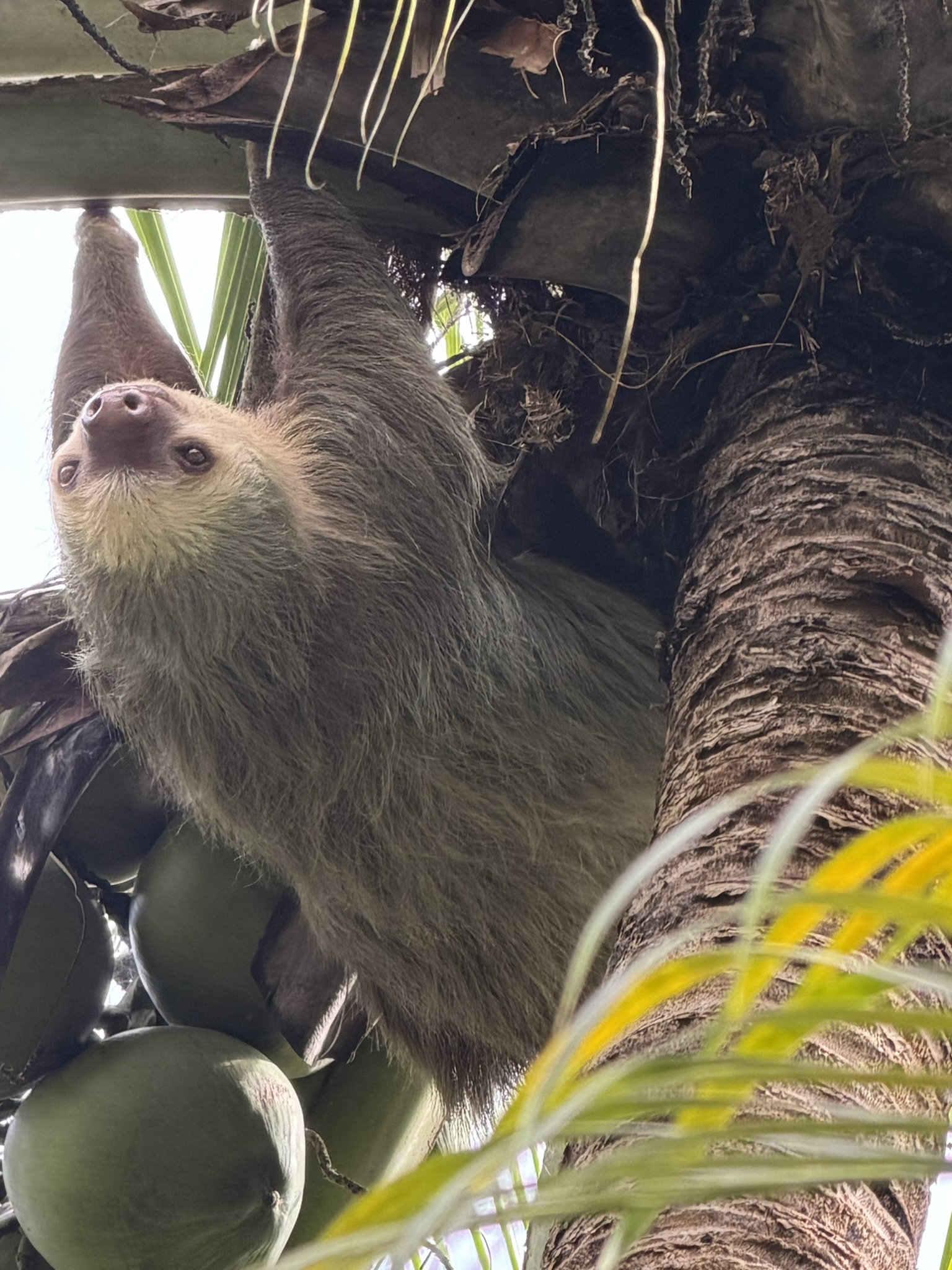 After our orientation walk, a few of us walked via the ocean beach (too wild to swim in) to the sea turtle conservancy, a small museum where we could learn about the turtles. As we entered the conservancy’s grounds, we immediately noticed a sloth moving through the coconut palm trees, just above our heads and alarmingly low to the ground. It seemed odd that it was climbing on the palm fronds, which didn’t seem to be strong enough to bear the weight of a sloth. A conservancy worker emerged, and she shared that it was indeed odd to see a sloth navigating the coconut trees.